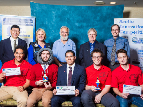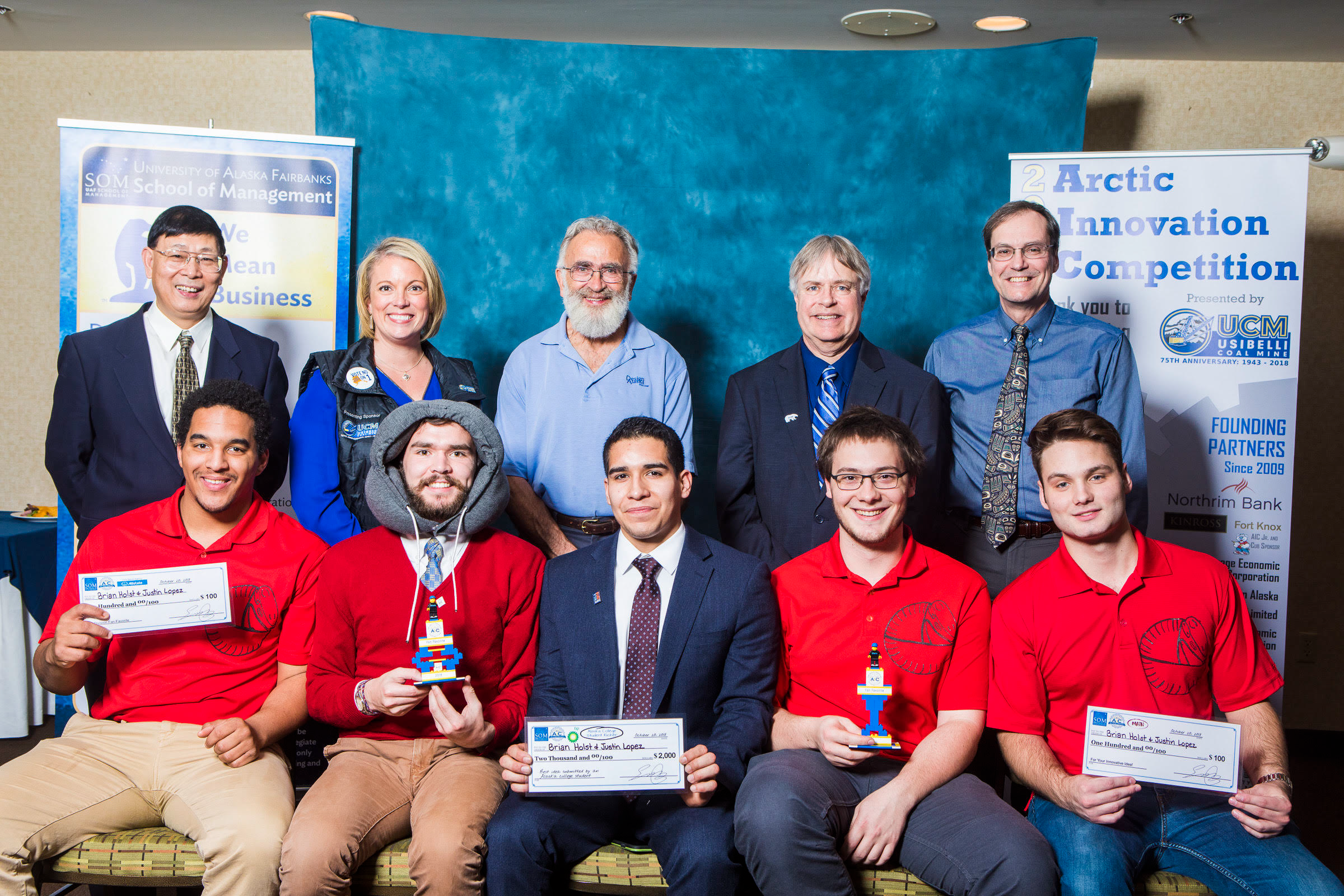 Above: Eric Hartley, far right, bottom row, and the rest of his team pose for a photo with their cash prizes and trophies. From Back Left; Dr. Ping Lan, Professor of Business Administration and founder of AIC, Lisa Cassino, Vice President of Public Relations for Usibelli Coal Mine, Jack Wilbur (Chair) for Design Alaska, Dr. Mark Herrmann, Associate Dean and Professor of Economics at UAF, and Paul Laywer, Vice President for Academics, Students & Research. Photo courtesy of Eric Hartley.