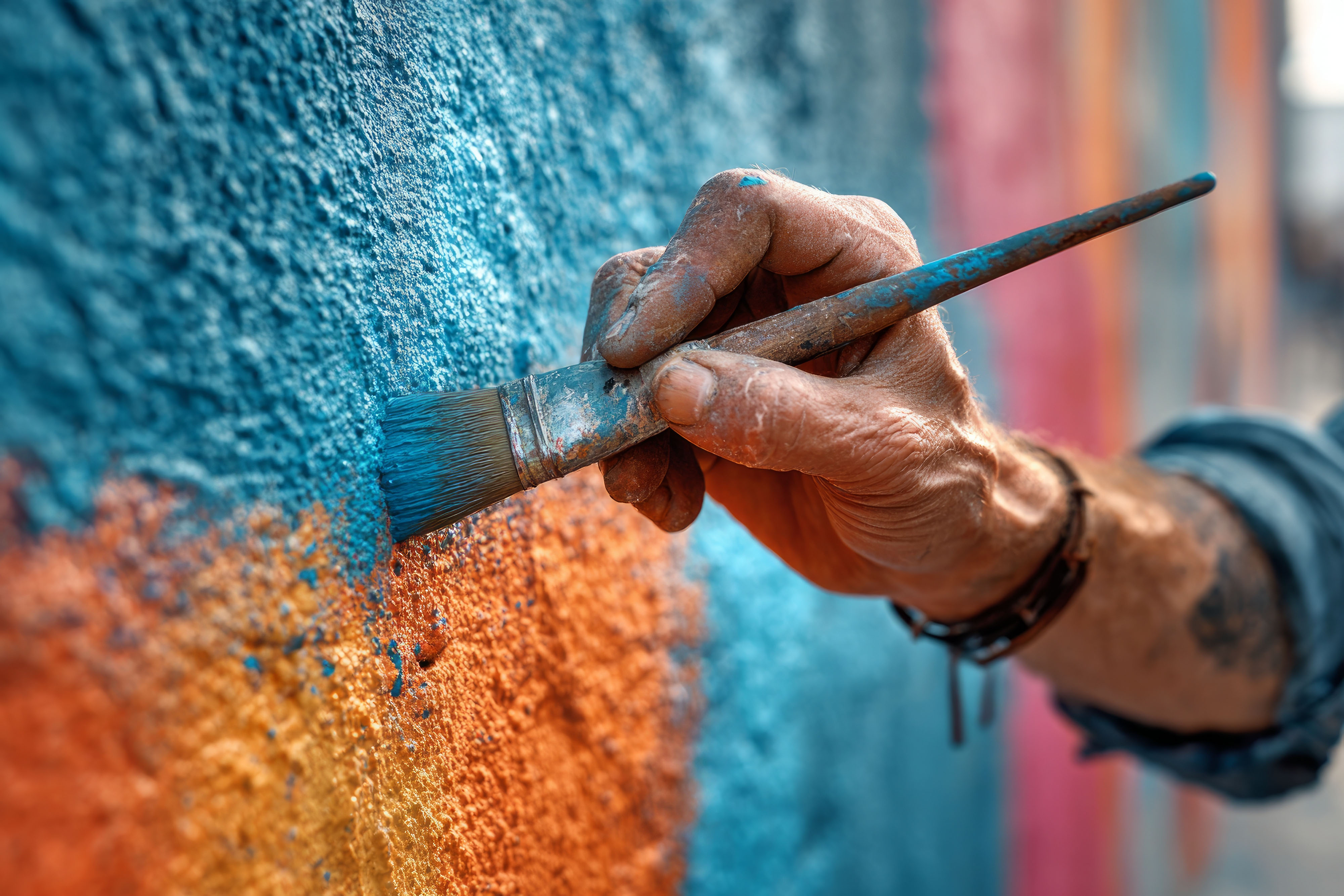 Created with images by AI_images - "a person painting a mural on a city wall, with vibrant colors, brushes, and focused expressions, promoting street art and urban culture." • Michael - "Artist painting colorful mural on a textured wall, adding vibrant colors to urban environment"