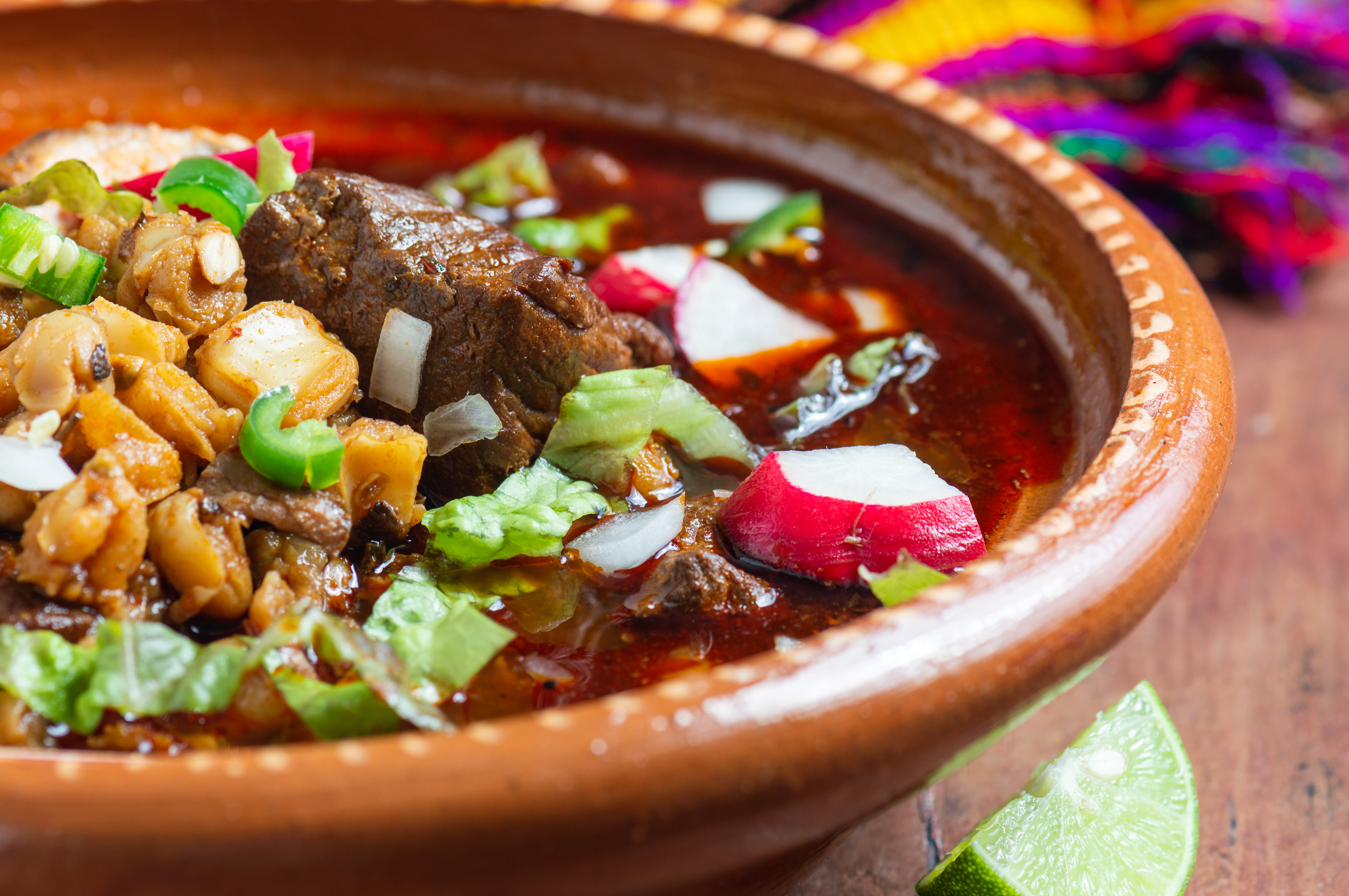 Pozole is a hearty and brothy Mexican soup made with hominy and meat, such as beef or pork, seafood, or vegetables. It has many different seasoning and topping options. Today, pozole is eaten in Mexican meat markets, family dinners, and celebrations, but it was originally considered a dish for the elite of the Aztec empire. For the Aztecs, pozole was eaten in communion to celebrate gods, good harvests, and seasonal changes.
