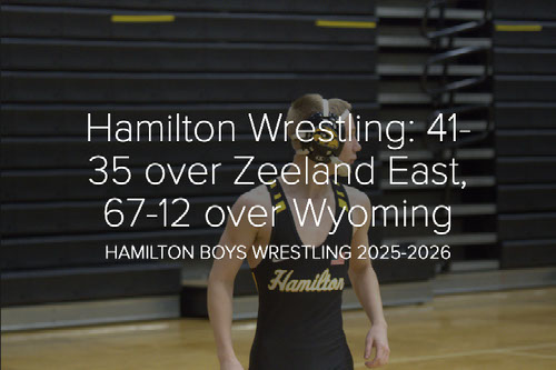 WHAT HAPPENED: Hamilton wrestling picked up two OK Black Conference wins last night, defeating Zeeland East 41–35 and Wyoming 67–12. The Zeeland East dual was closely contested, while Hamilton built a large margin against Wyoming with a strong team performance. Nine Hamilton wrestlers went undefeated across the two matches, helping the team finish conference competition with a 4–1 record. CAPTION: Broden VanWieren takes the mat for Hamilton in OK Black Conference action.