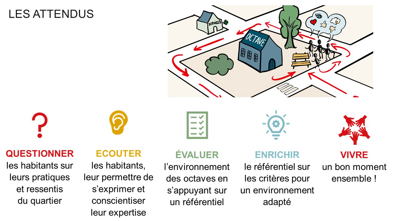 C’est dans la perspective d'un référentiel sur l'environnement des opérations d'habitat adapté au vieillissement qu’a émergé l’idée d’élaborer des promenades sensibles avec des habitants des opérations d’habitat accompagné, les Octave. Initialement prévues dans le cadre de l’évaluation du programme Octave pilotée par la MEL (juillet 2020-avril 2021), elles ont dû être reportées eu égard au contexte sanitaire. Elles se sont finalement déroulées en novembre 2021.