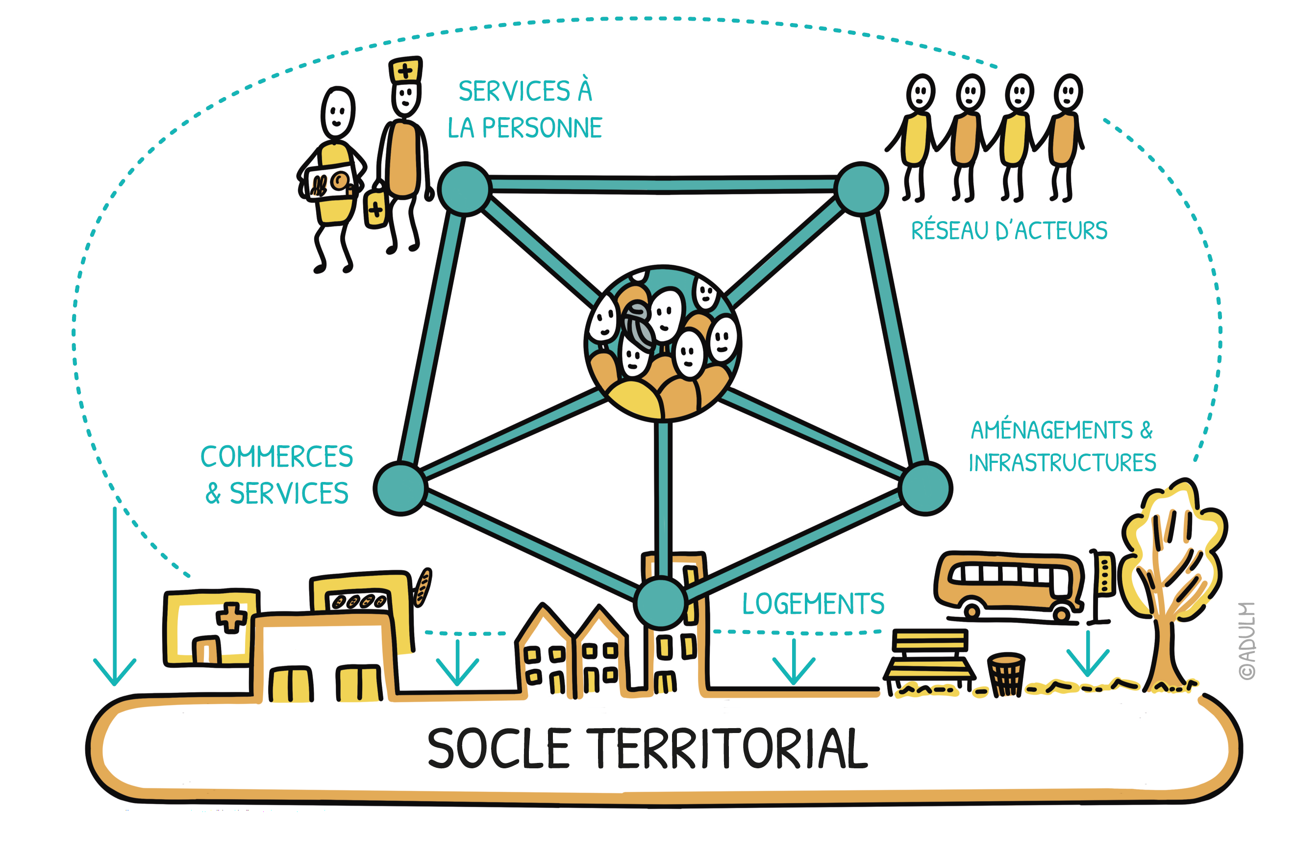 Des éléments de cet écosystème doivent pouvoir être implantés et aménagés sur les territoires de vie des personnes (présence de commerces et de services, lieux d’accueil, infrastructures de transports, espaces publics adaptés, etc.). Si d’autres éléments n’ont pas toujours nécessité à être ancré sur un socle territorial, ils doivent néanmoins pouvoir être reliés aux habitants et leurs besoins et interconnectés entre eux au service du projet de vie des personnes (services à la personne, soins médicaux, services d’aide à la mobilité, commerces ambulants, etc.)