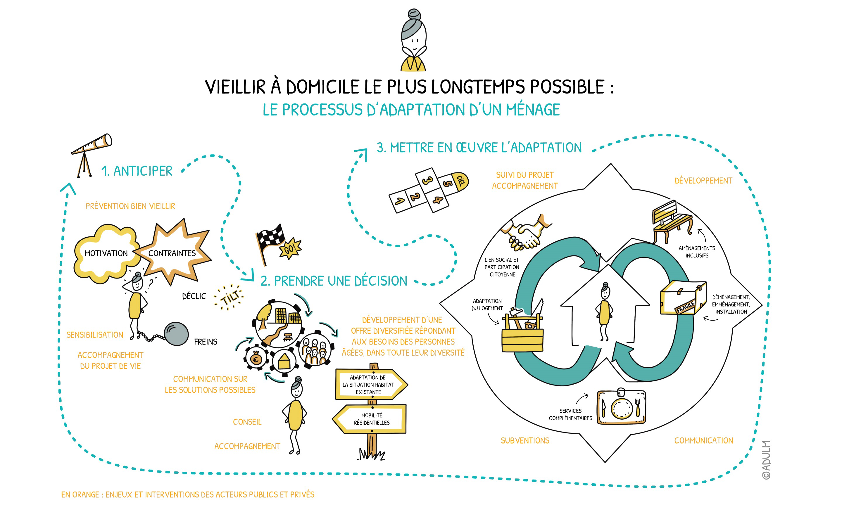 Cette démarche s’appuie principalement sur l’animation d’un espace d’échanges associant des partenaires publics et privés, issus du monde du logement et celui du médico-social, tous acteurs à leur manière dans le champ de l’habitat et du vieillissement.