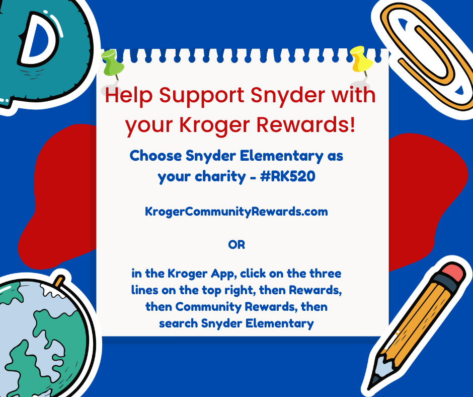 Don't forget to select Snyder PTO as your charity to support for Kroger, Box Tops & Mabel's Labels.