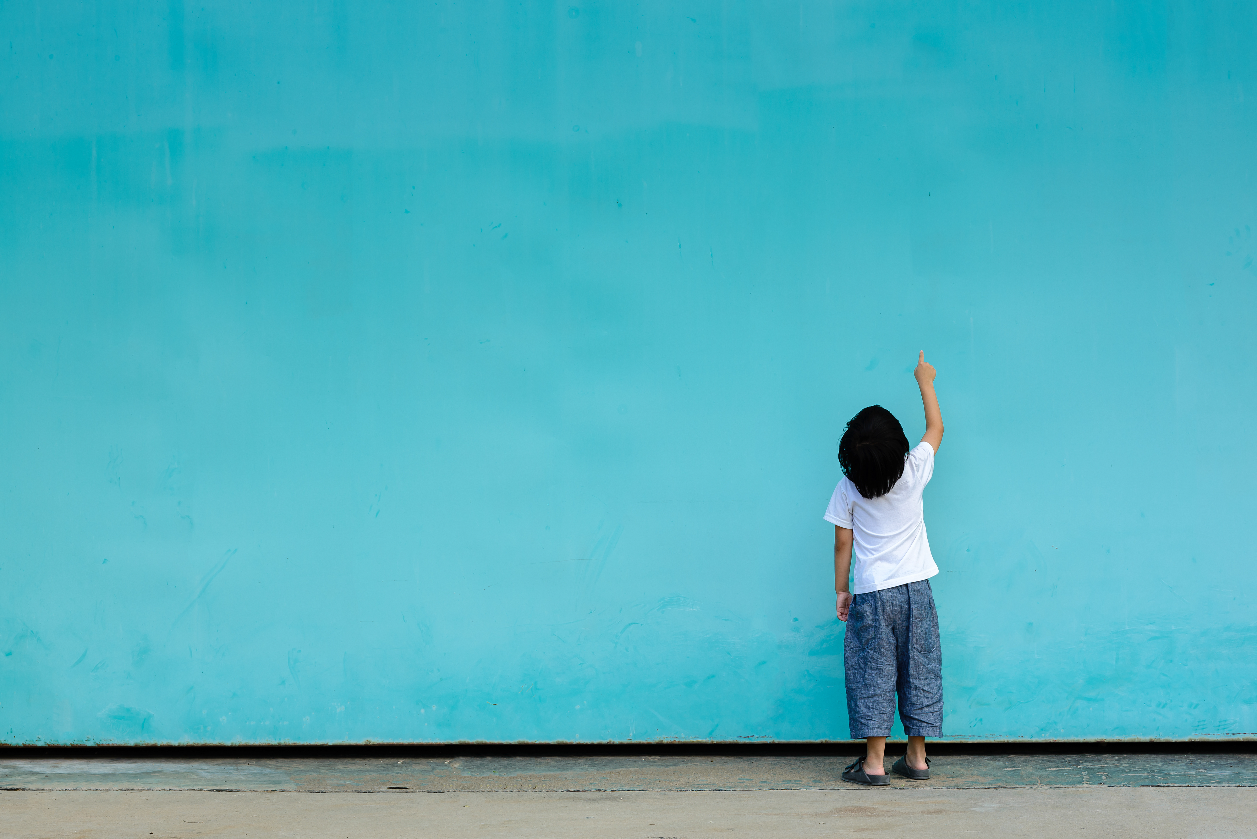 Créé à partir d’une image de : stockbob - "The little boy turned his back and pointed at the blank light blue wall which was a copy space."