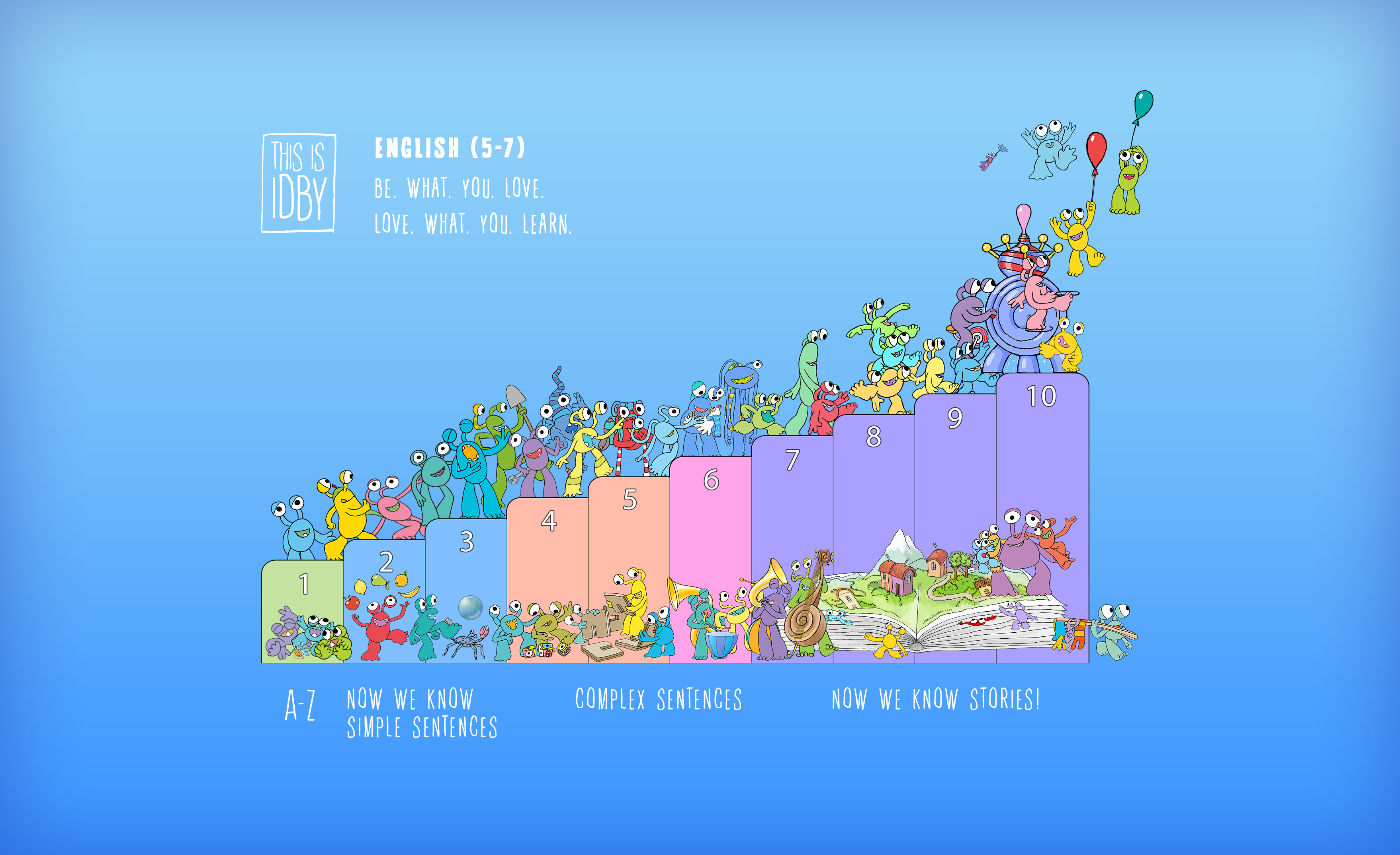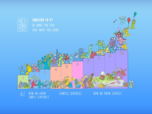 There are twelve main Id characters. Idby was designed to improve empathy and critical evaluation in young readers. Each character is defined by what they love. Readers progress from simple English sounds, to words, simple and complex sentences and then full stories. Each level is accompanied with video and song .