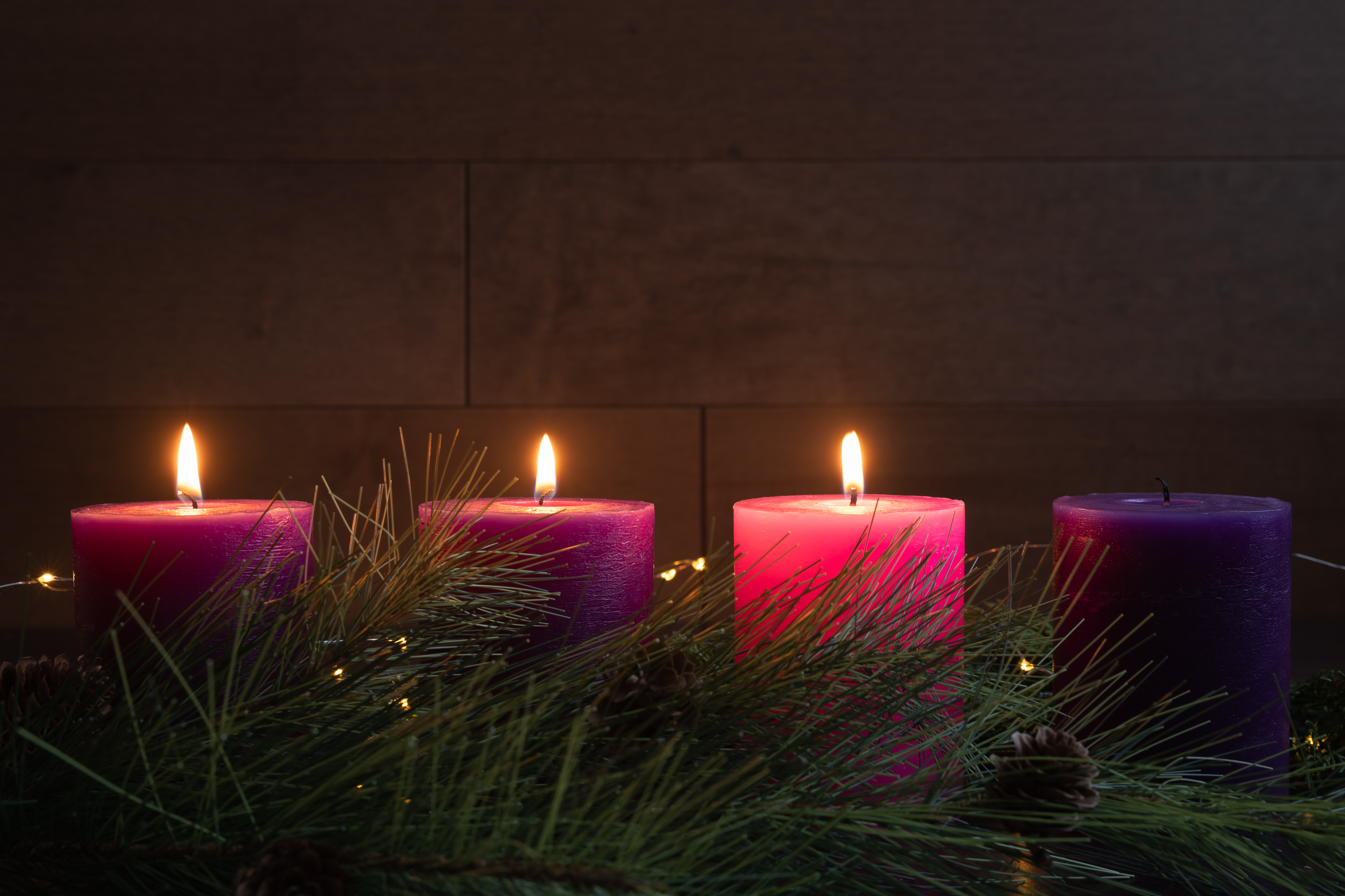 One candle is pink- why? There are four candles on the Advent wreath. Three are purple and lit on the first, second and fourth Sundays of Advent. The pink candle is lit on the third Sunday of Advent, which we call Gaudete Sunday. On this Sunday, in addition to the pink candle, the priest wears a pink vestment which he might refer to as a "rose."