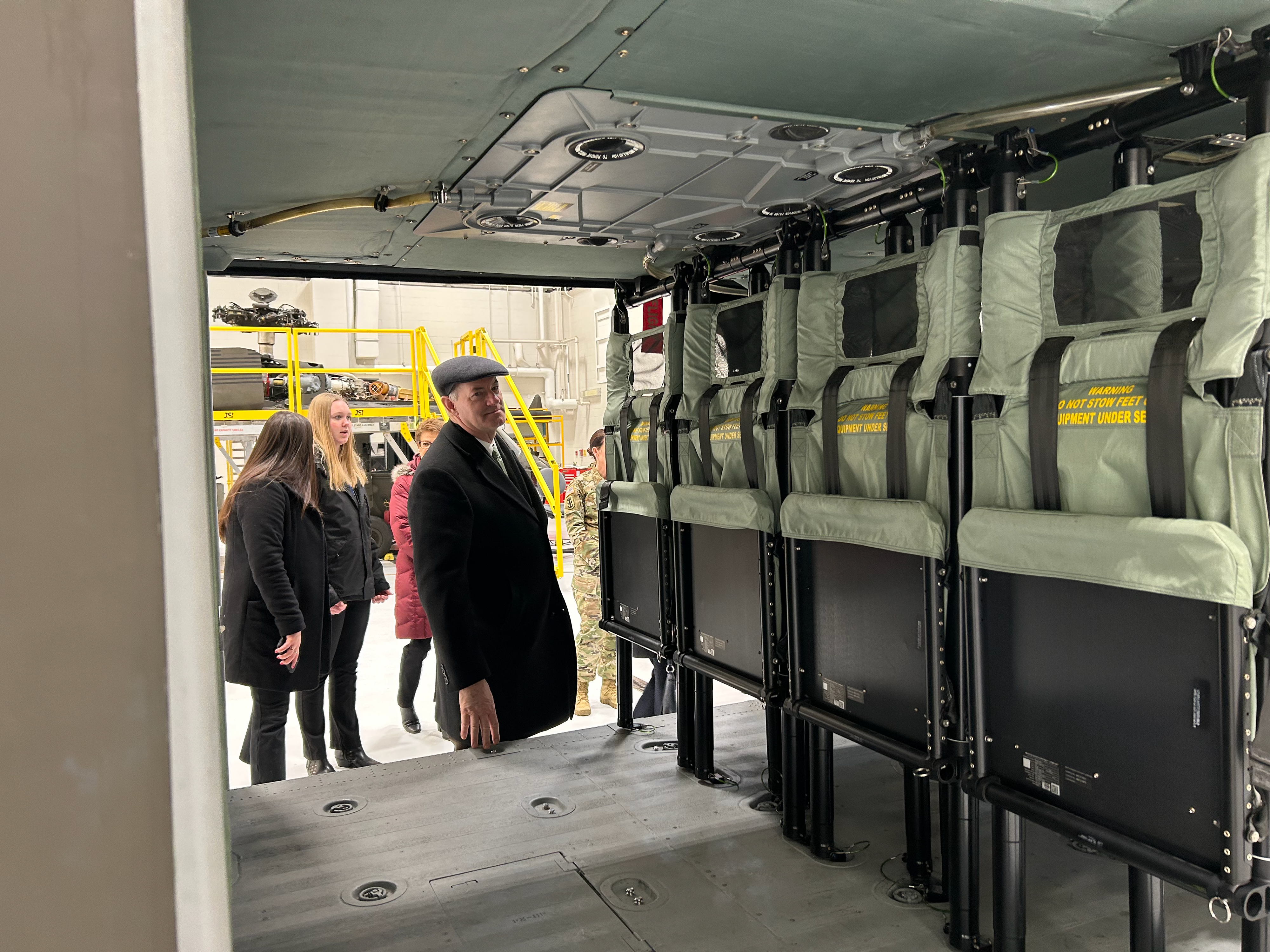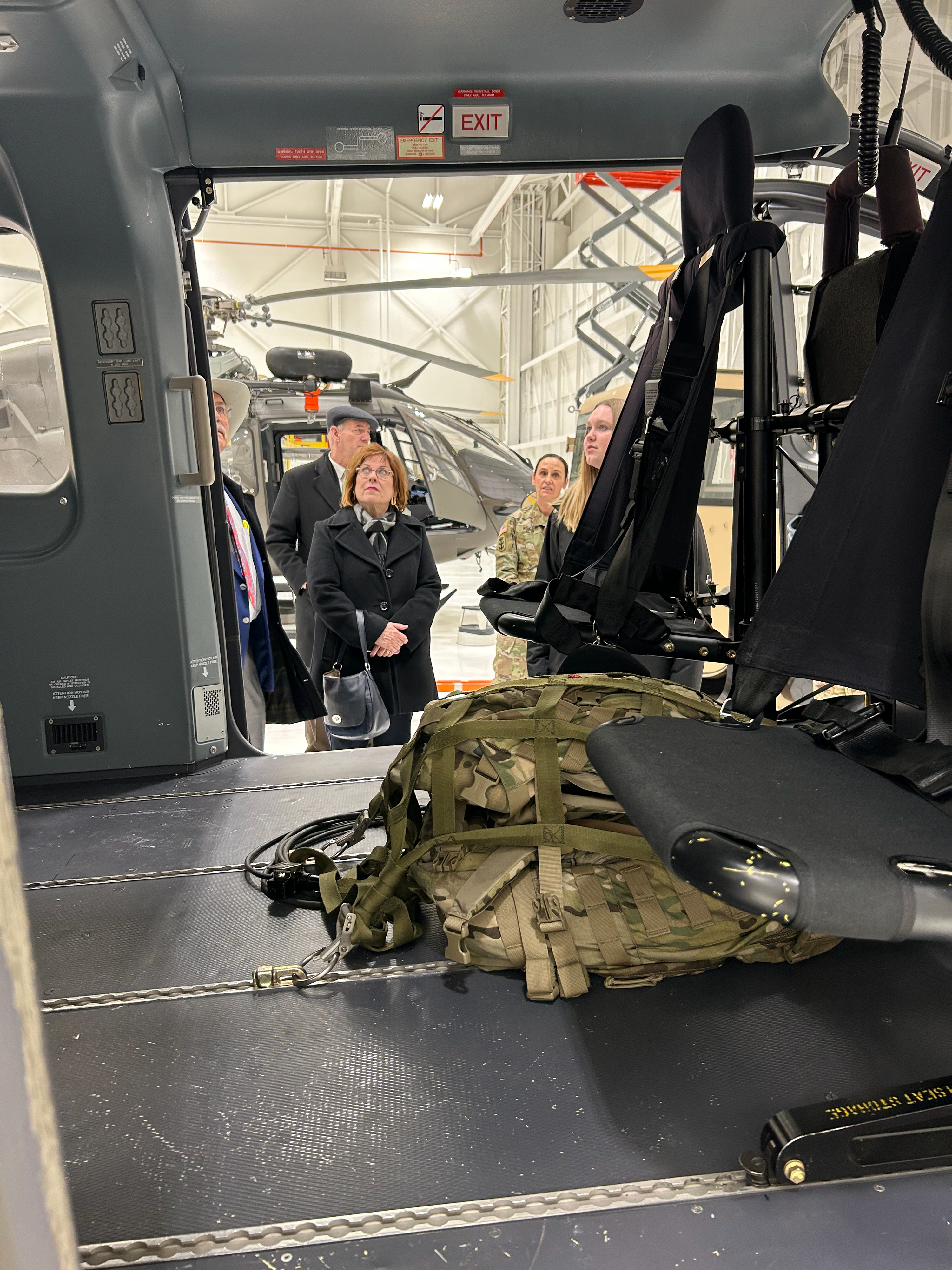Lt. Col. Mike Green, left, discusses the capabilities of a UH-72A Lakota helicopter during a legislator and staff visit to the Army Aviation Support Facility, March 9, 2023, Bismarck. (National Guard photos by Capt. Vanessa Lennick, N.D. National Guard Visual Information)