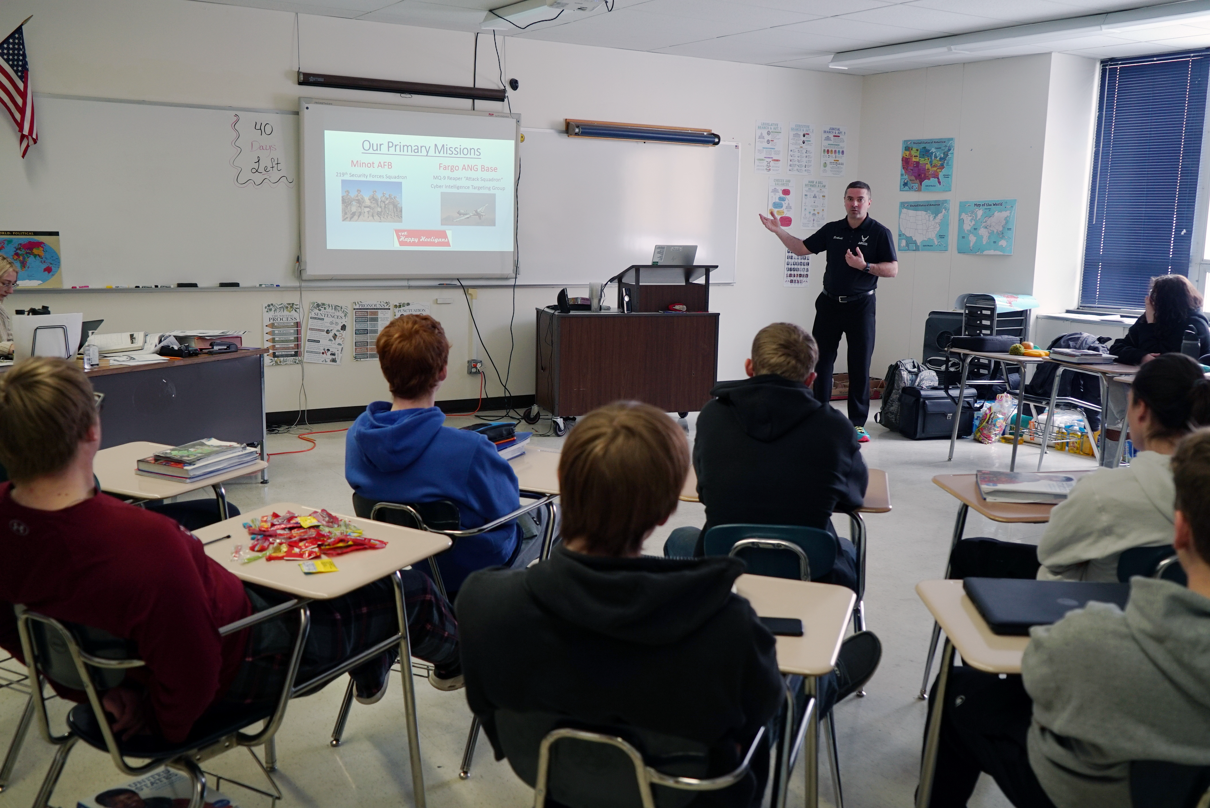 Tech Sgt. Bradly Berthold, N.D. Air National Guard recruiter, visited with Center - Stanton junior and senior high school students, Center, N.D. March, 8, 2023. (National Guard story and photos by Sgt. 1st Class Charles Highland, N.D. National Guard Public Affairs Office)