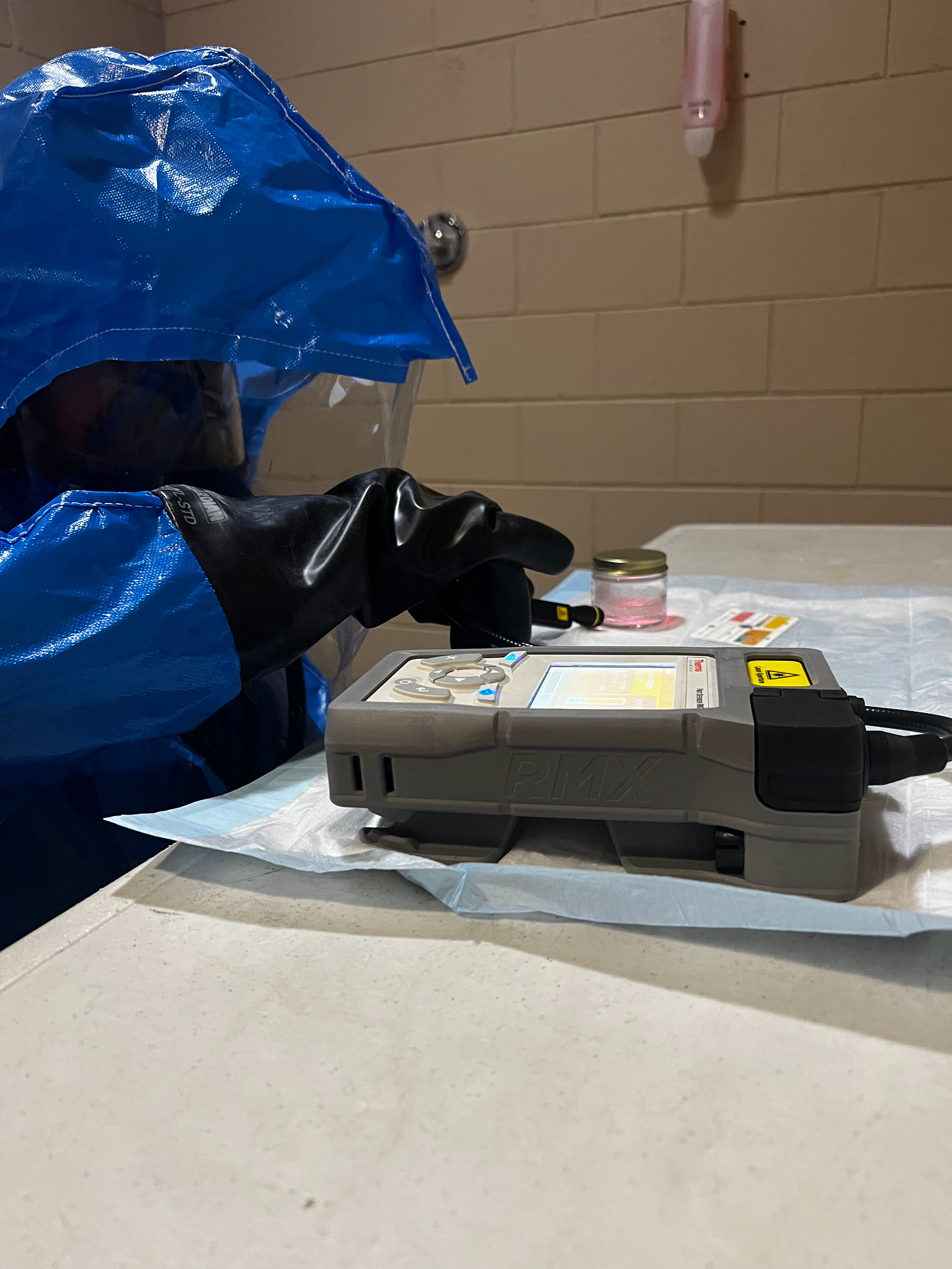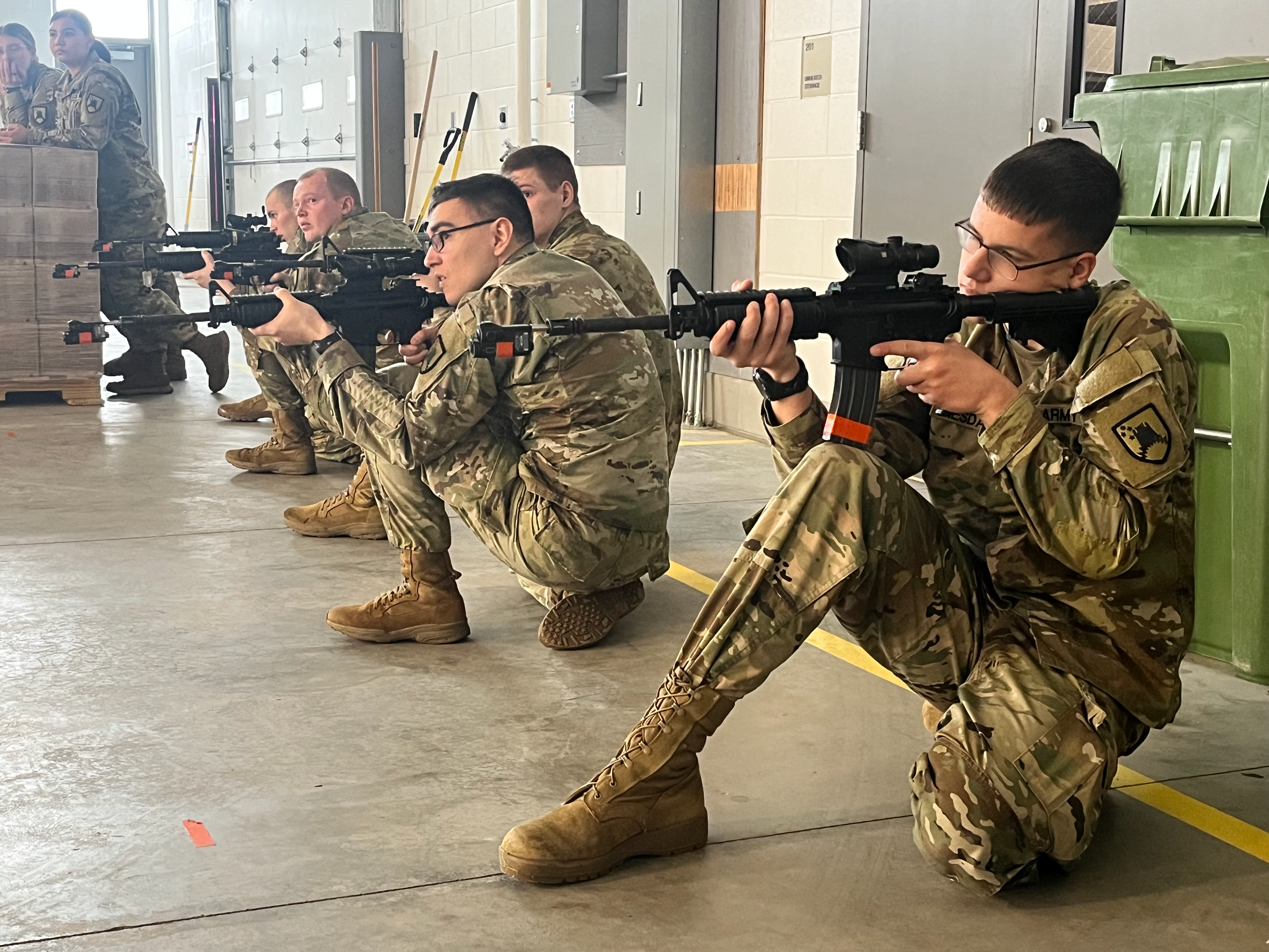 Top Left: Soldiers of the 141 Maneuver Enhancement Brigade (MEB) fire on the Laser Marksmanship Training System (LMTS) during a Preliminary Marksmanship Instruction (PMI) course, March 11, 2023, Fargo, N.D. (Photo by Sgt. 1st Class Ashley Johlfs, 141st MEB). Bottom Left: Lt. Col. Michael Green, State Army Aviation Officer, Joint Force Headquarters, and Chief Warrant Officer 3 Scott Dickmeyer, Company D, 1st Battalion, 112th Aviation Regiment (1-112th AVN), prepare for a night training flight in a UH-72A Lakota helicopter, Fargo, N.D., March 2, 2023. (Photo by 2nd Lt. Brett Reynolds, 1-112th AVN). Right: Sgt. Brent LaFontaine, 81st Civil Support Team (CST), conducts a joint hazard assessment team (JHAT) exercise at the Bismarck Events Center, March 9, 2023, as a practice for real-world missions. The team scanned multiple BEC areas to ensure the public would be safe while attending an event. (Photo by Sgt. 1st Class Chris Keller, 81st CST)
