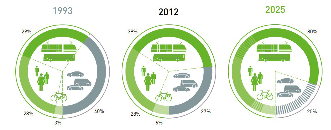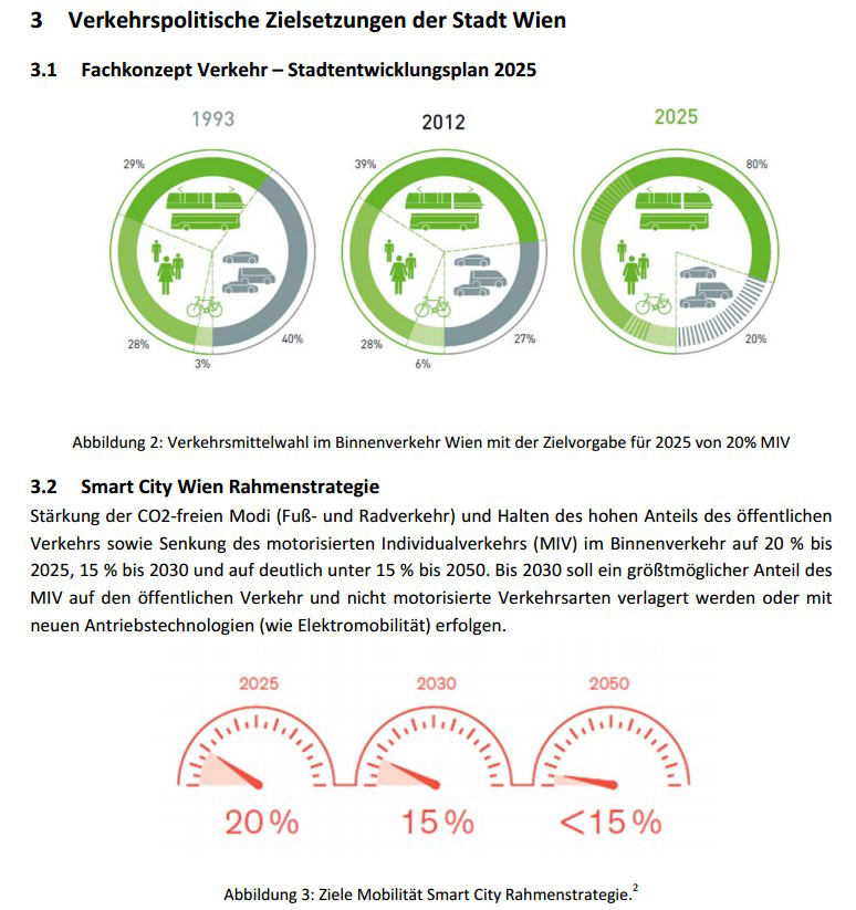 DAS MÜSST IHR EUCH AUF DER ZUNGE ZERGEHEN LASSEN: "In coming years as in the past, Vienna’s traffic and transport policy will systematically promote eco-friendly means of transport (public transport, walking and cycling). Translated into modal split figures, the goal is “80-20”. This means that, by 2025, Vienna’s population should travel 80 percent of all trips with public transport, by bicycle or on foot, while the share of motorised individual traffic is to be reduced to 20 percent"