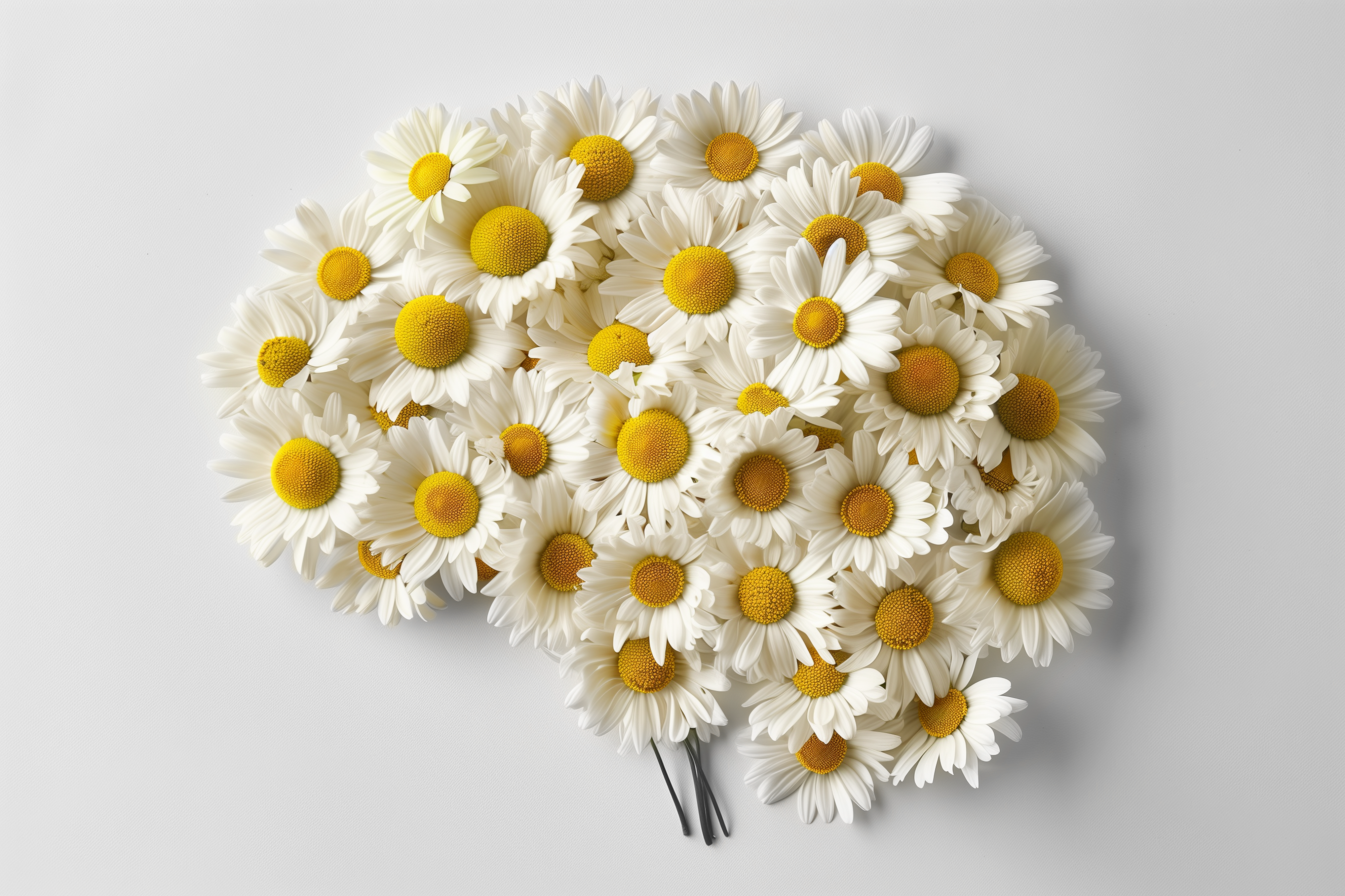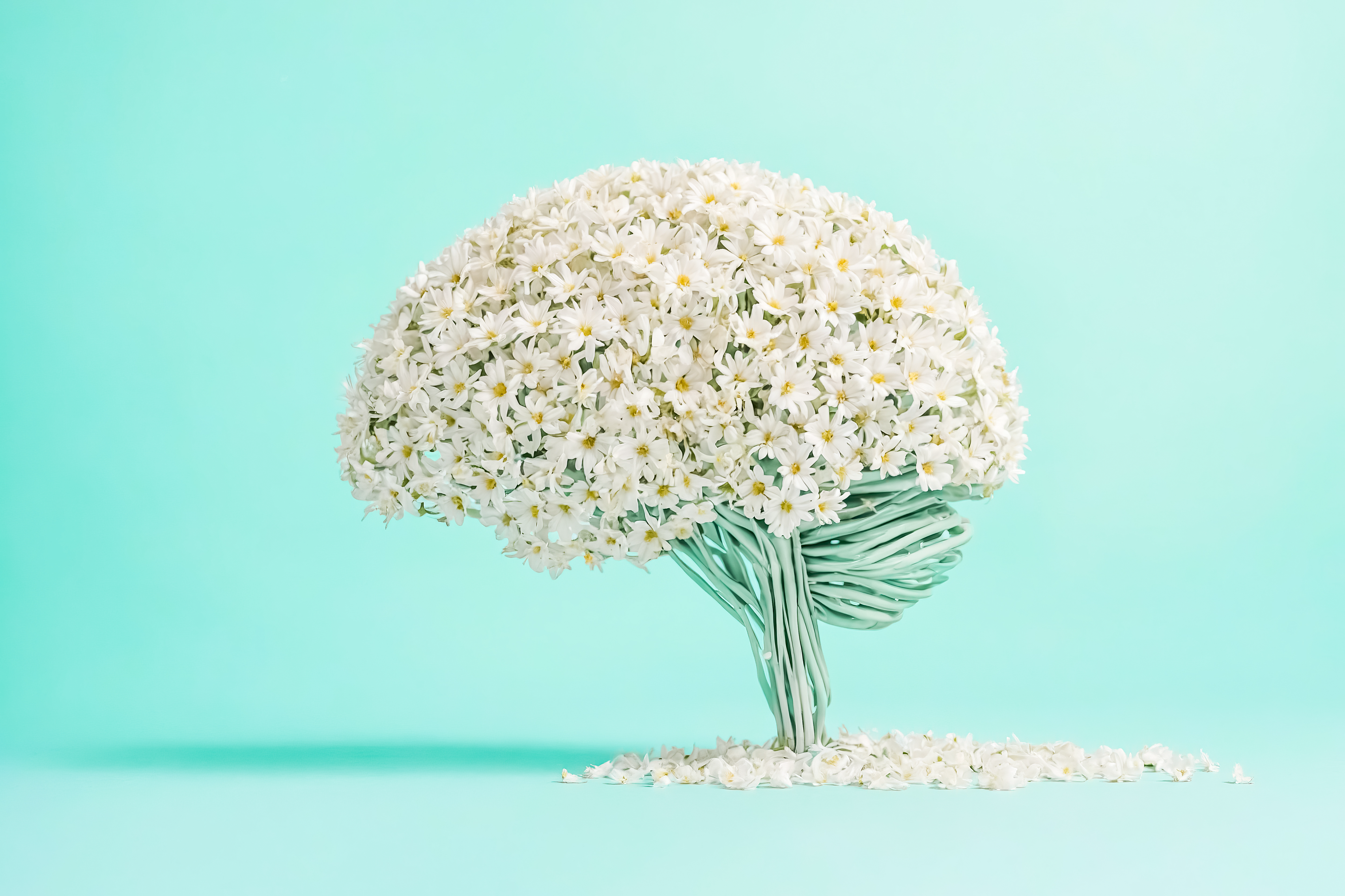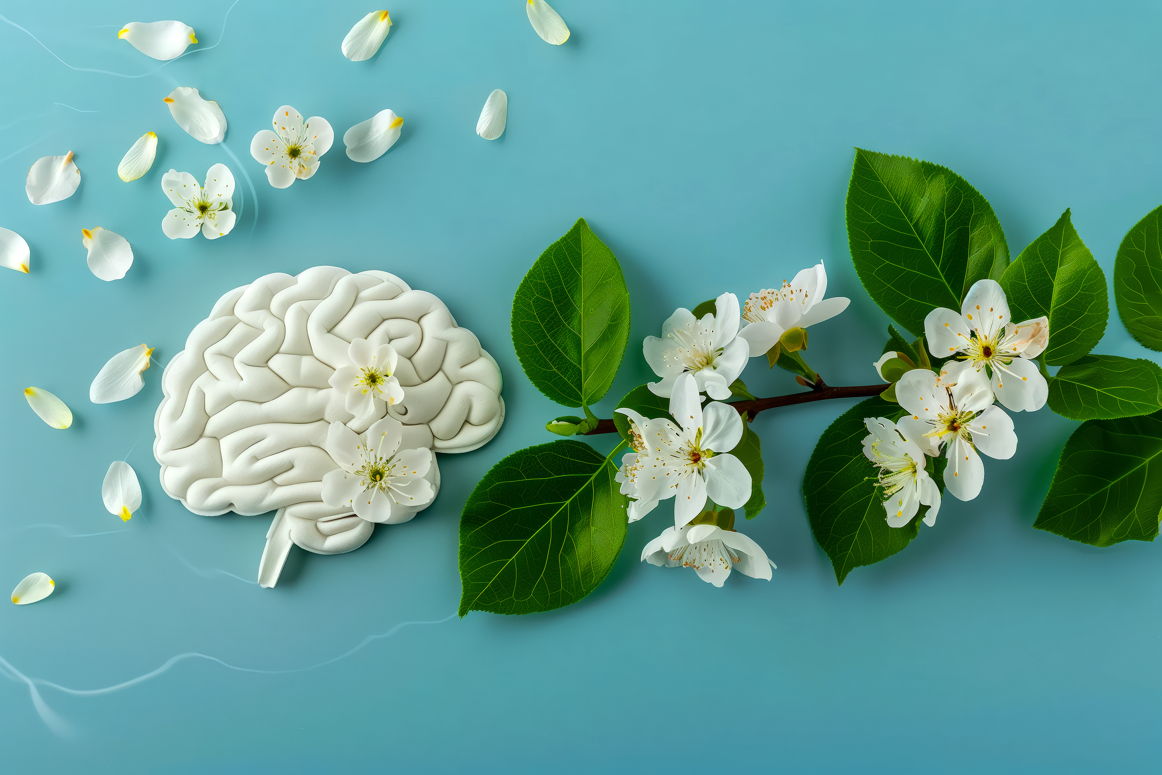 Created with images by Irina - "The shape of the brain is lined with daisies on a white background." • Mayava - "Mental wellbeing concept with brain made from flower bloom blowing in the wind" • Rysak - "White Flower Brain on a Turquoise Background" • Brad Pict - "What's new?" • JAYANNPO - "Old shabby painted brick wall texture - blue masonry retro background"