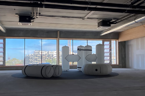 UTs : kit qui joue de la multiplication d’identiques pour pouvoir s’adapter à différentes typologies de lieux. Ces poufs offrent des singularités grâce aux variables provenant du procédé de fabrication où seules des matières valorisées / ou à revaloriser sont employées.