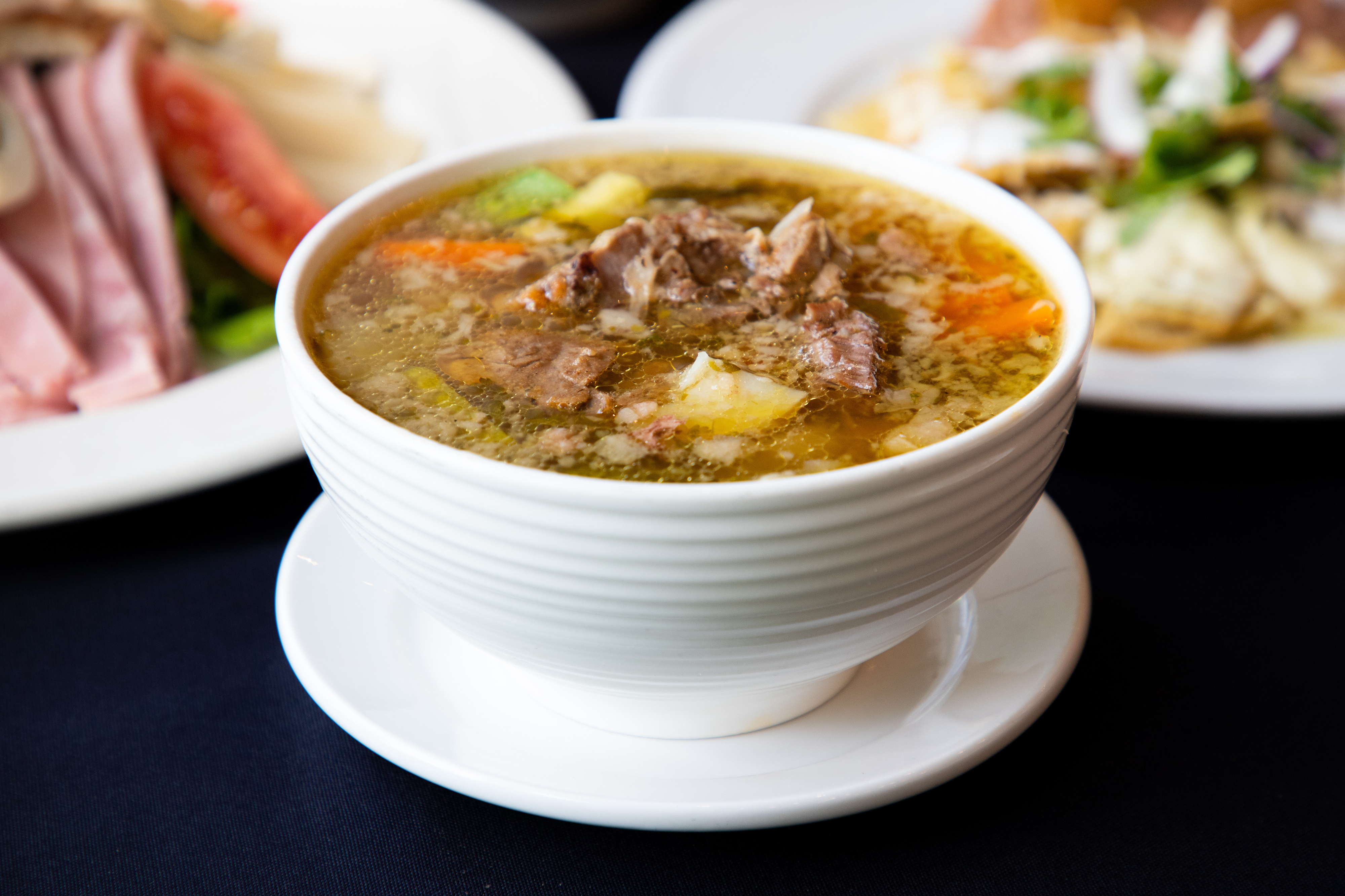beef broth, a hearty and robust broth, featuring slow- cooked beef and fresh vegetables