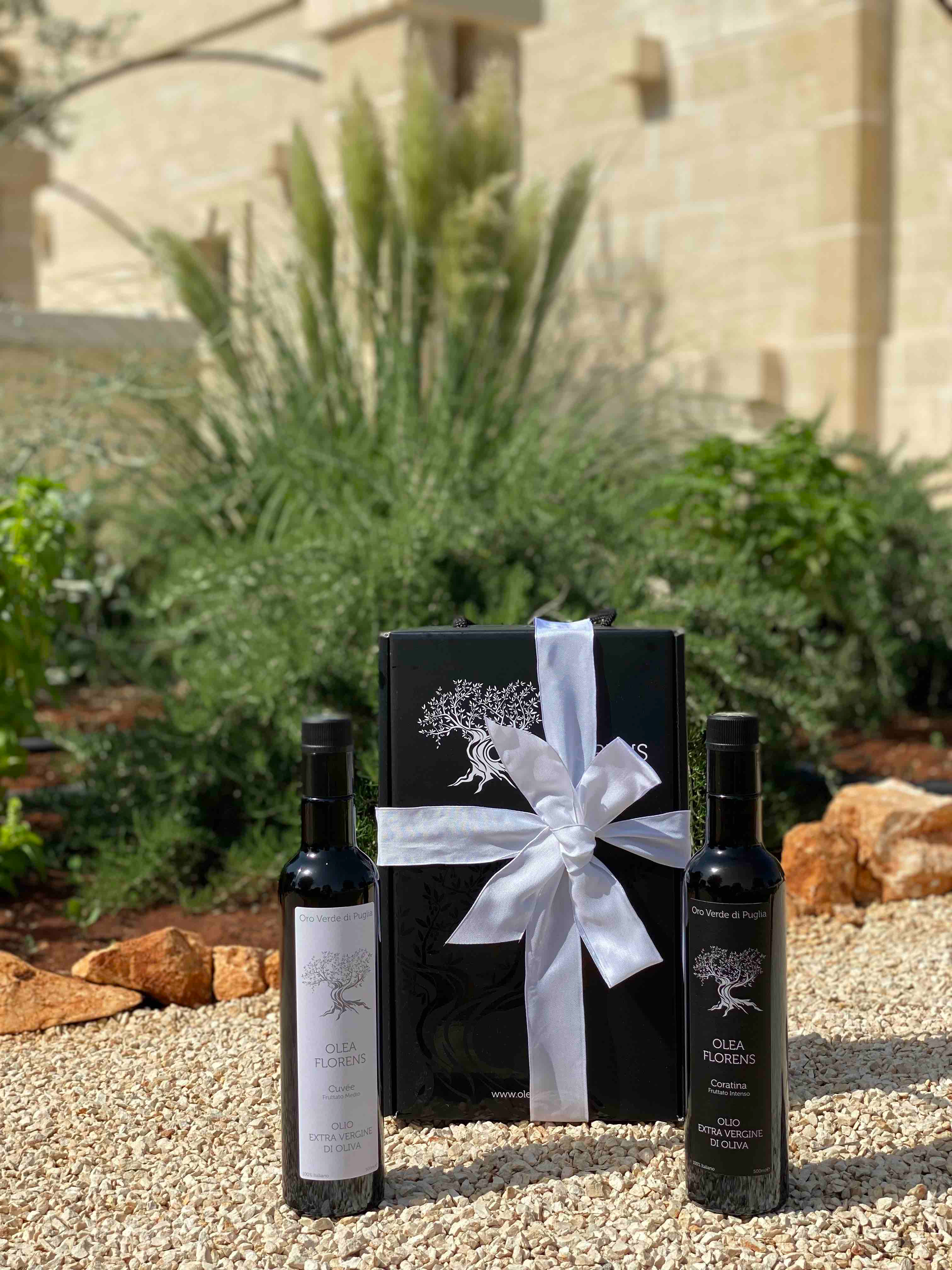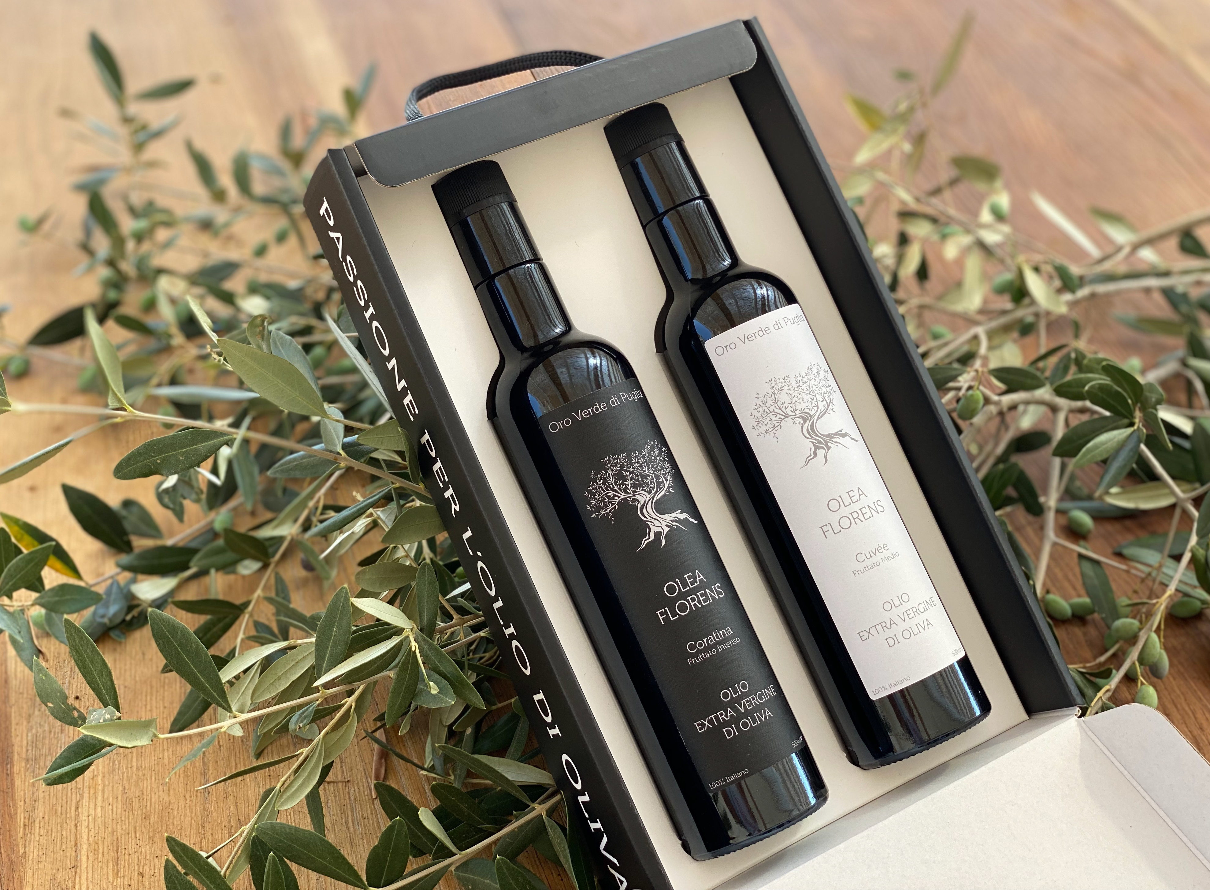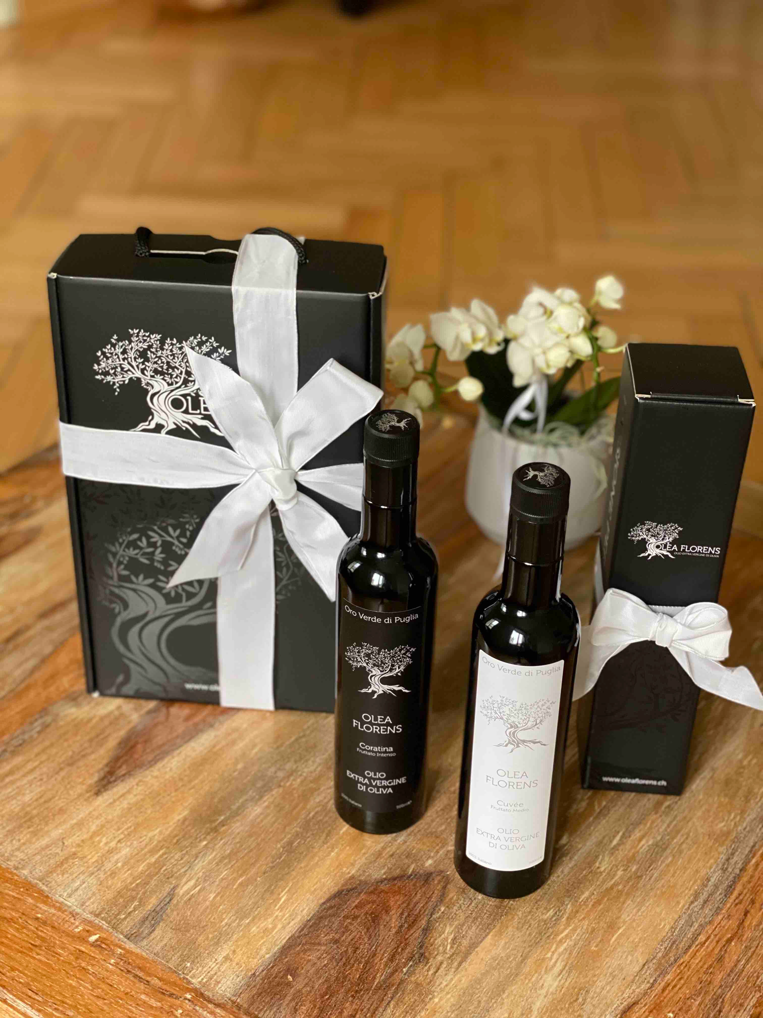 Die Doppelbox enthält je eines unserer beiden Olivenöle in Flaschen à 500ml. Bei der Einzelbox kann man eines der beiden Öle wählen.