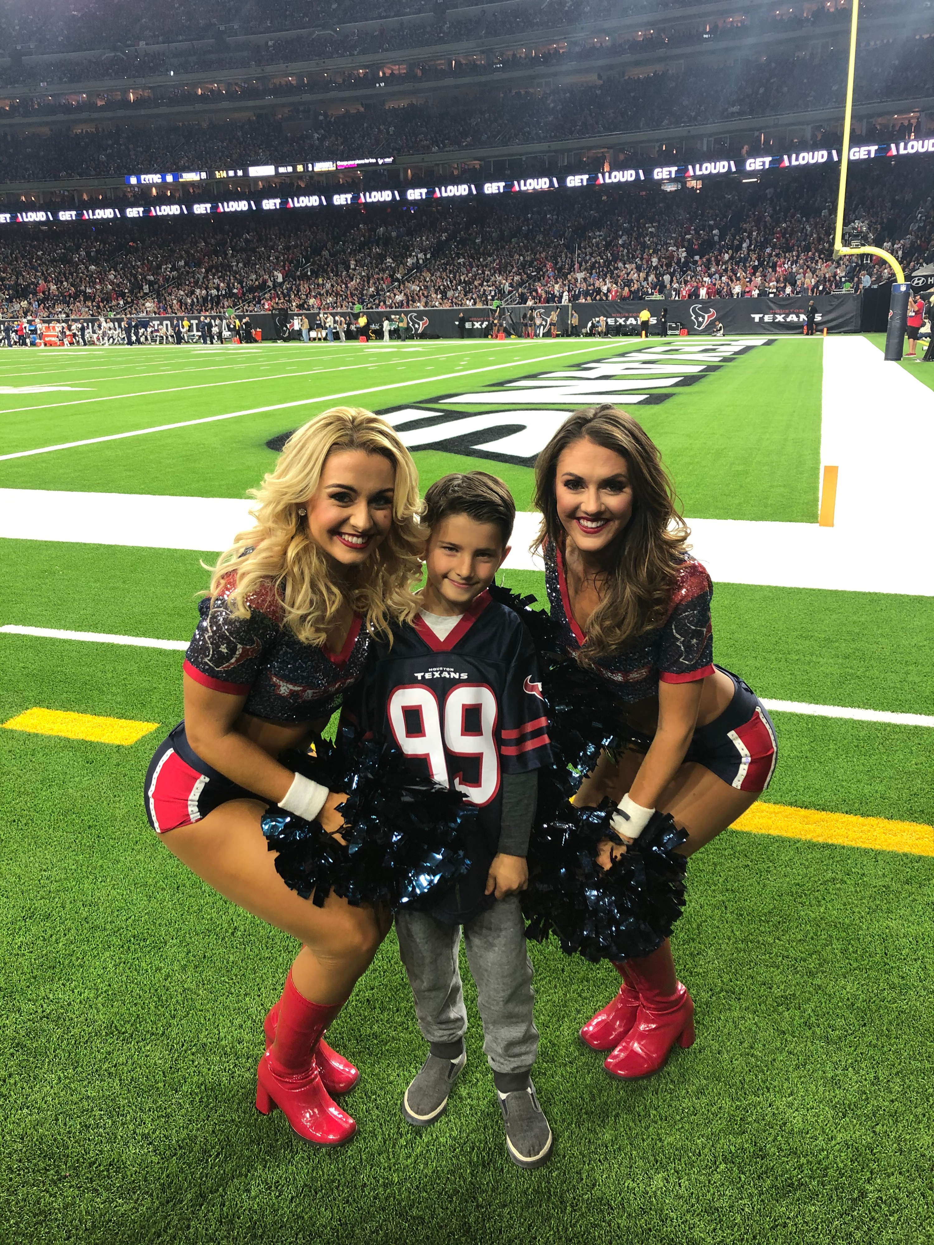 Master Sgt. Al Herda Jr. and grandson Ben sit in the stands at the Houston Texans vs. New England Patriots game on Dec. 1 in Houston.