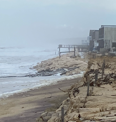 My dad and I decided to drive around town to see the aftermath of the storm. We arrived at the beach where these heavy sandbags as big as my dining table laid along the beach. I didn’t realize the true size of these until I saw it with my own eyes! As I stood on top of this man-made barrier, I thought to myself how there used to be layers of sand on top of it. To think that these have been here for years, yet after four storms it looks completely different. Between the remaining dunes and the sandbags, smaller ones from years ago are still there, but aren't as supportive as the larger ones. To prevent the hotels from further damage, hundreds of these sandbags were placed by the Army Corp of Engineers before their project commenced. Without this barrier, the hotels would be completely destroyed which would impact the town's economy and form even more issues. (Photo by Anna Carman)