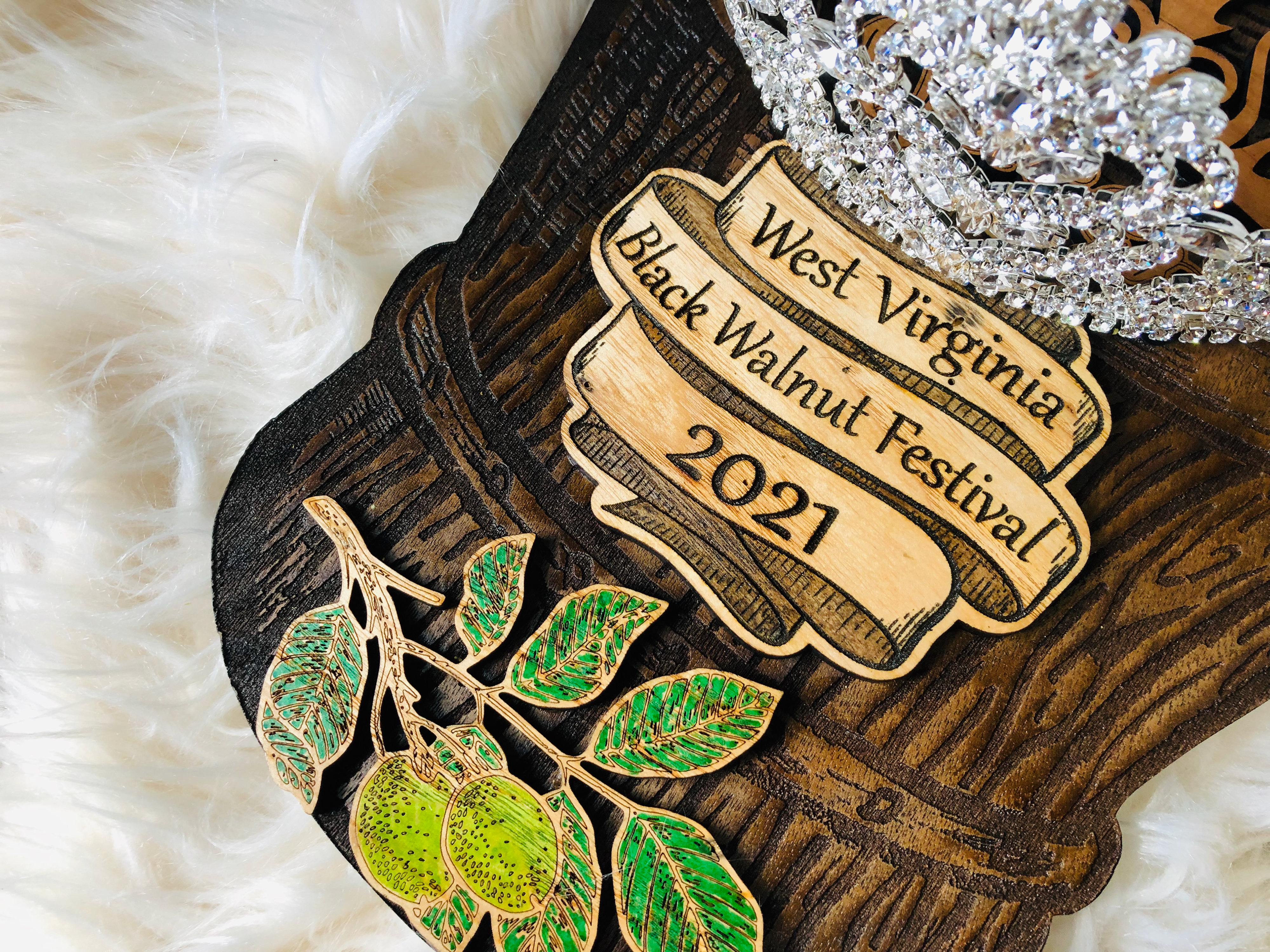 Sterling Silver Swarovski Stone Crown, Rhinestone Sash, Wood Plaque made of WV Black Walnut Wood, Flowers, Black Walnut Pin, Commemorative Festival Coronation Keepsake Arm Bouquet, Headshot Session Valued at $500, Coronation Photo Session valued at $250, Gift Package Provided by Local Businesses, Gift Package Provided During the 2025 WV Black Walnut Festival, Farewell Gift Package