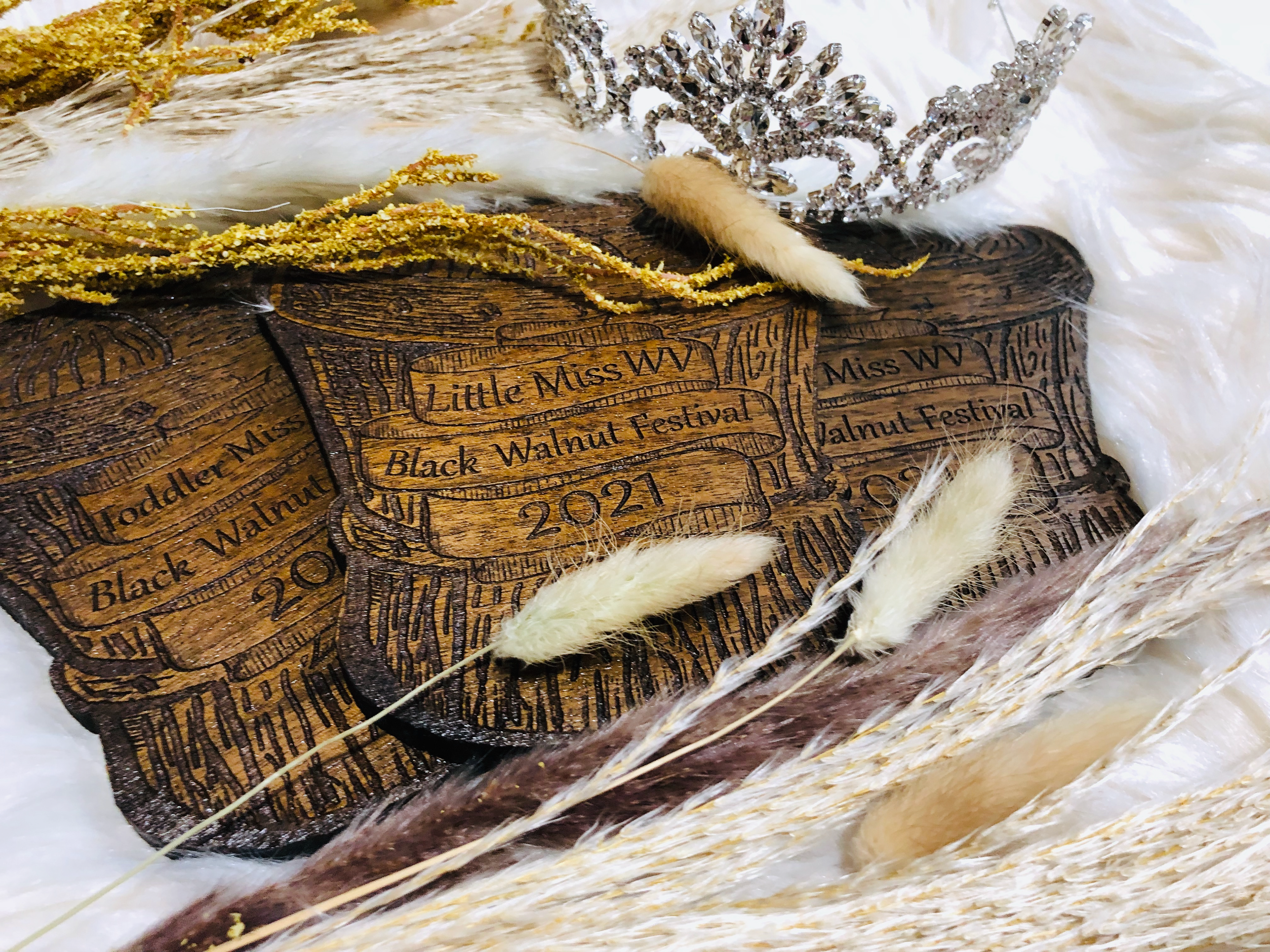 Sterling Silver Swarovski Stone Crown, Rhinestone Sash, Wood Plaque made of WV Black Walnut Wood, Flowers, Black Walnut Pin, Black Walnut Earrings, Commemorative Festival Coronation Keepsake Bouquet, Headshot Session Valued at $500, Coronation Photo Session valued at $250, Gift Package Provided by Local Businesses, Gift Package Provided During the 2025 WV Black Walnut Festival, Farewell Gift Package