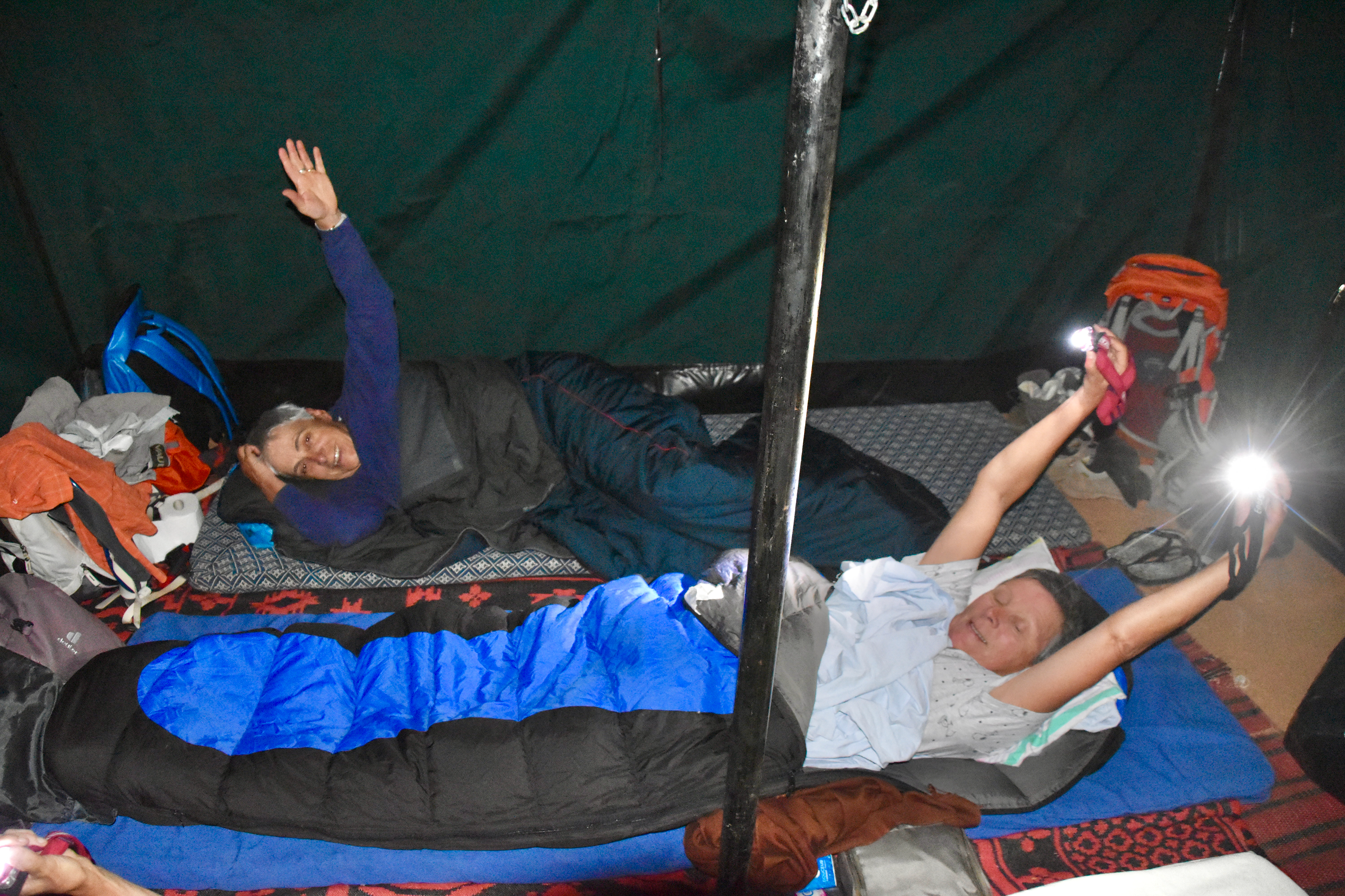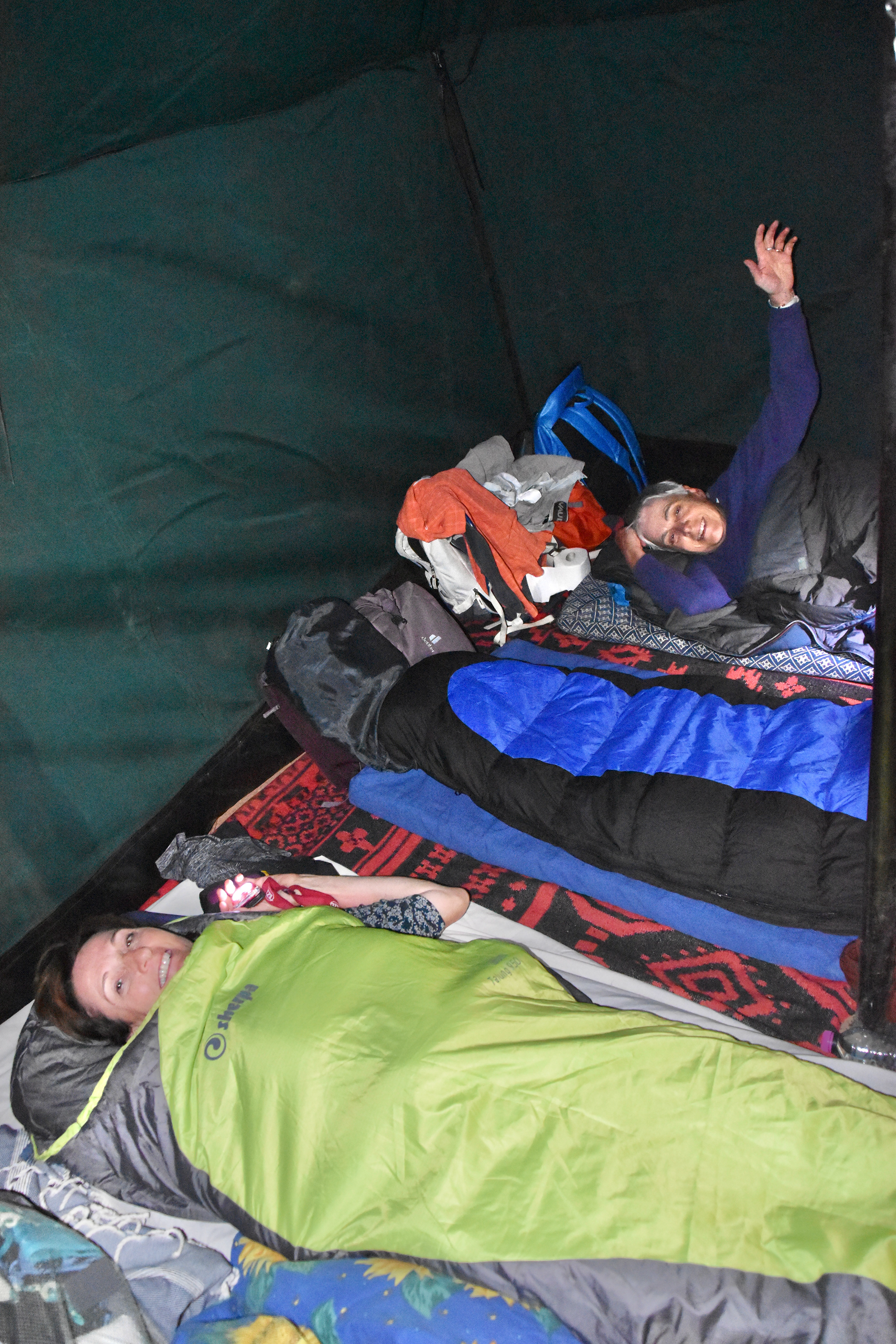 Extinction des feux après une première journée de marche assez tranquille. Puisque nous ne sommes que 4 nous avons décidé de ne dormir que dans une seule tente, moins de travail pour l’équipe et bien plus rigolo pour nous. Alignées sans être trop serrées c’est absolument idéal. À refaire !