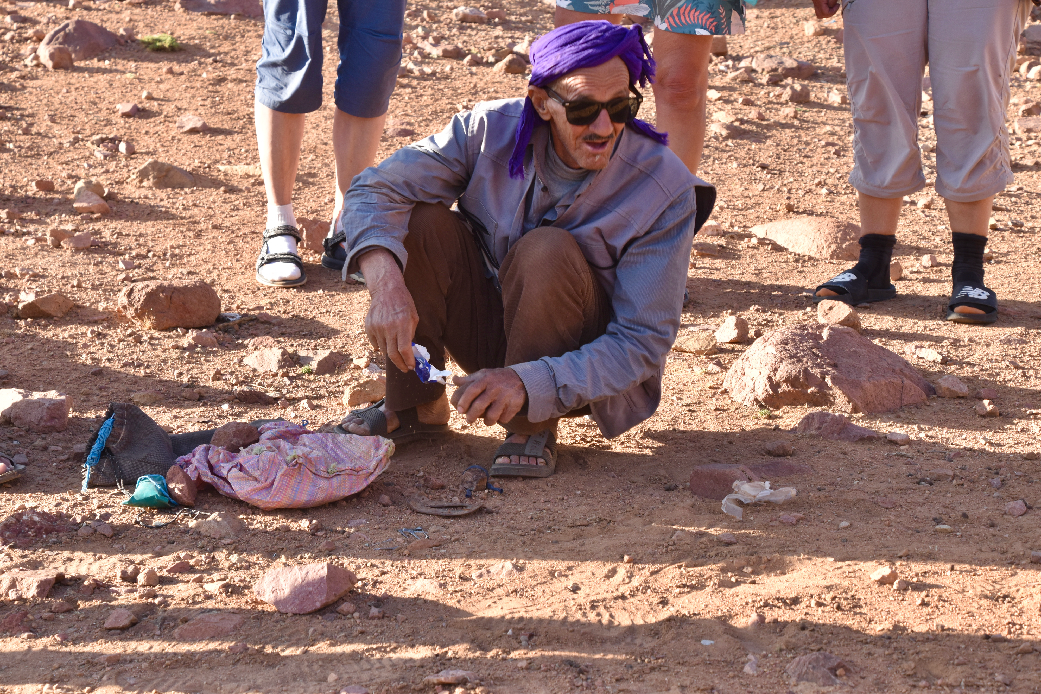Après le thé d’arrivée, une “ Geneviève “ façon Saghro ! Il faut toute la patience et la débrouillardise de Sa’id pour venir à bout de cette réparation de fortune, qui tiendra, il faut le souligner, jusqu’à la fin du circuit.
