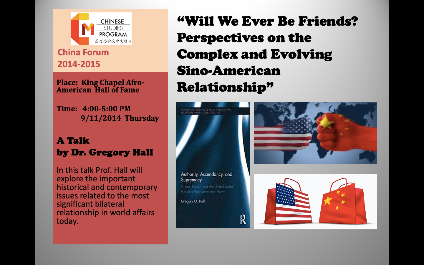 China Forum is an indispensable platform for Chinese Studies. Scholars, public figures, and policy makers from the U.S. government come to Morehouse to give speeches. These speakers form an integral component of the course work offered by the Chinese Studies Program. China Forum not only inspires students to learn more about China's history and society but also motivates them to study Mandarin Chinese with diligence and purpose.