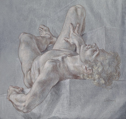 Paul Cadmus’ drawing on paper, Male Nude NM 59 was bought on the 1969 Student-led Art Buying Trip to New York City. J. D Wilson, an alumnus of Wake Forest and patron of the arts in North Carolina, spoke about his experience as part of the trip. “College campuses in the 60s became hot spots for activism and new ideas”, Wilson said in a recent interview. He talked about a dramatic shifting in the time they were living in, much like the ones we are living in today. Mr. Wilson noted that there became a very mainstream sexualization of women, and fixation on the female form. Women’s bodies were projected everywhere in mass media for public consumption. When the cohort members of the 1969 art buying trip came across this Paul Cadmus piece, they thought “oh that’s different” recalls Wilson. They were so used to seeing the female form everywhere, and almost nothing of the male form. Not only this, but it was depicted in a way that was not inherently sexual, despite the title: Male Nude. The cohort members were also used to seeing more formal oil paintings, and Cadmus’s piece is much more loose, as it is made with crayon. This new take on the male form coincided with the modern nature of the Reece collection, making it a perfect addition.