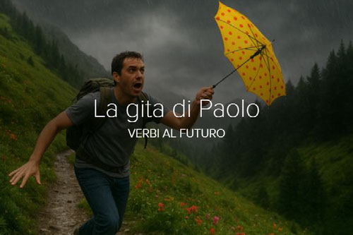 Quando Paolo arriverà ai piedi della montagna, inizierà a salire con entusiasmo. Vedrà fiori colorati, ascolterà gli uccellini e scatterà mille foto. A un certo punto, però, il cielo diventerà nero, nerissimo. In cinque minuti pioverà così forte che Paolo non vedrà più il sentiero. Allora lui aprirà il suo ombrello giallo con i pois rossi… che con il vento volerà via subito come un elicottero. Paolo correrà, griderà, salterà nelle pozzanghere, ma l’ombrello scapperà tra gli alberi e non tornerà più.