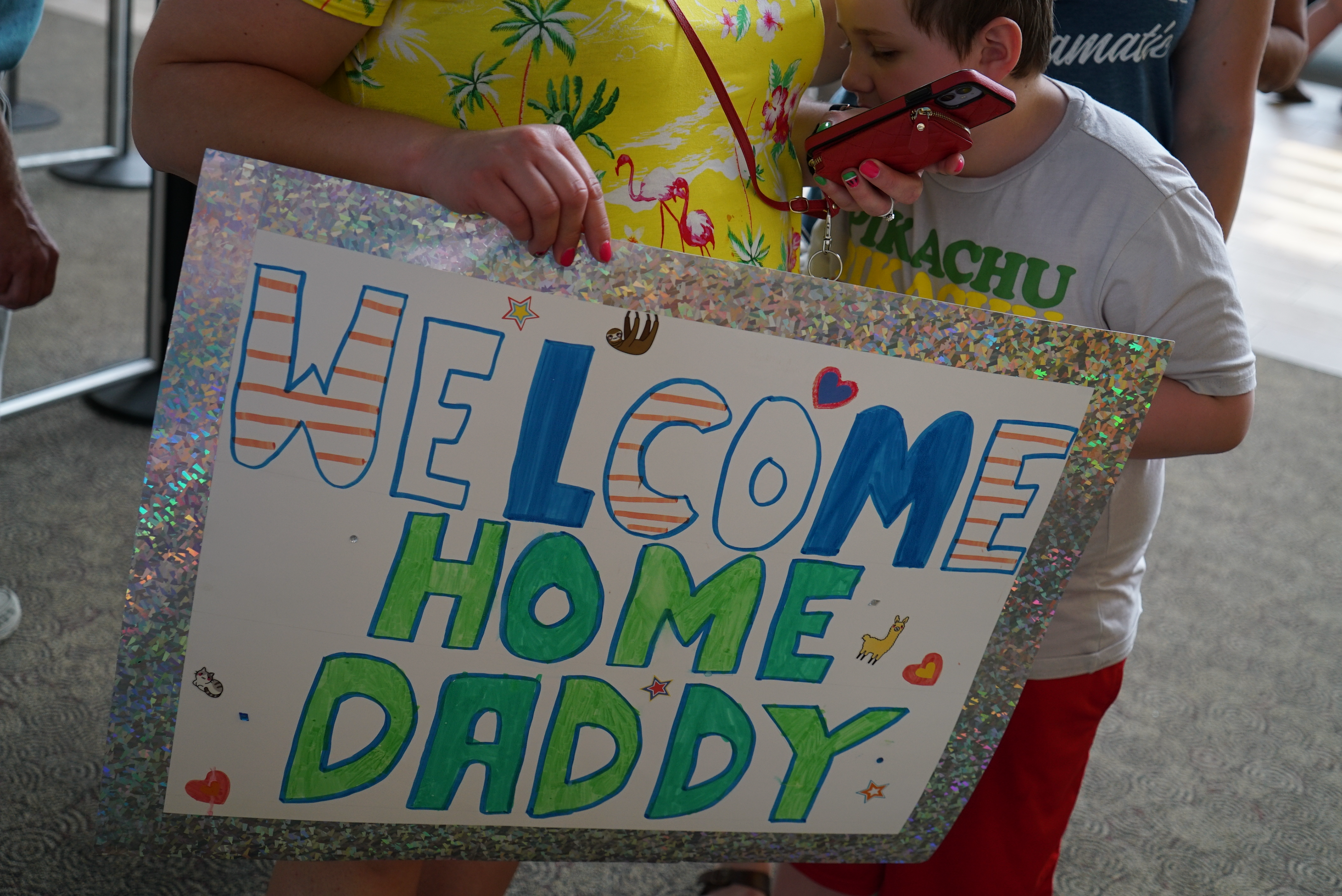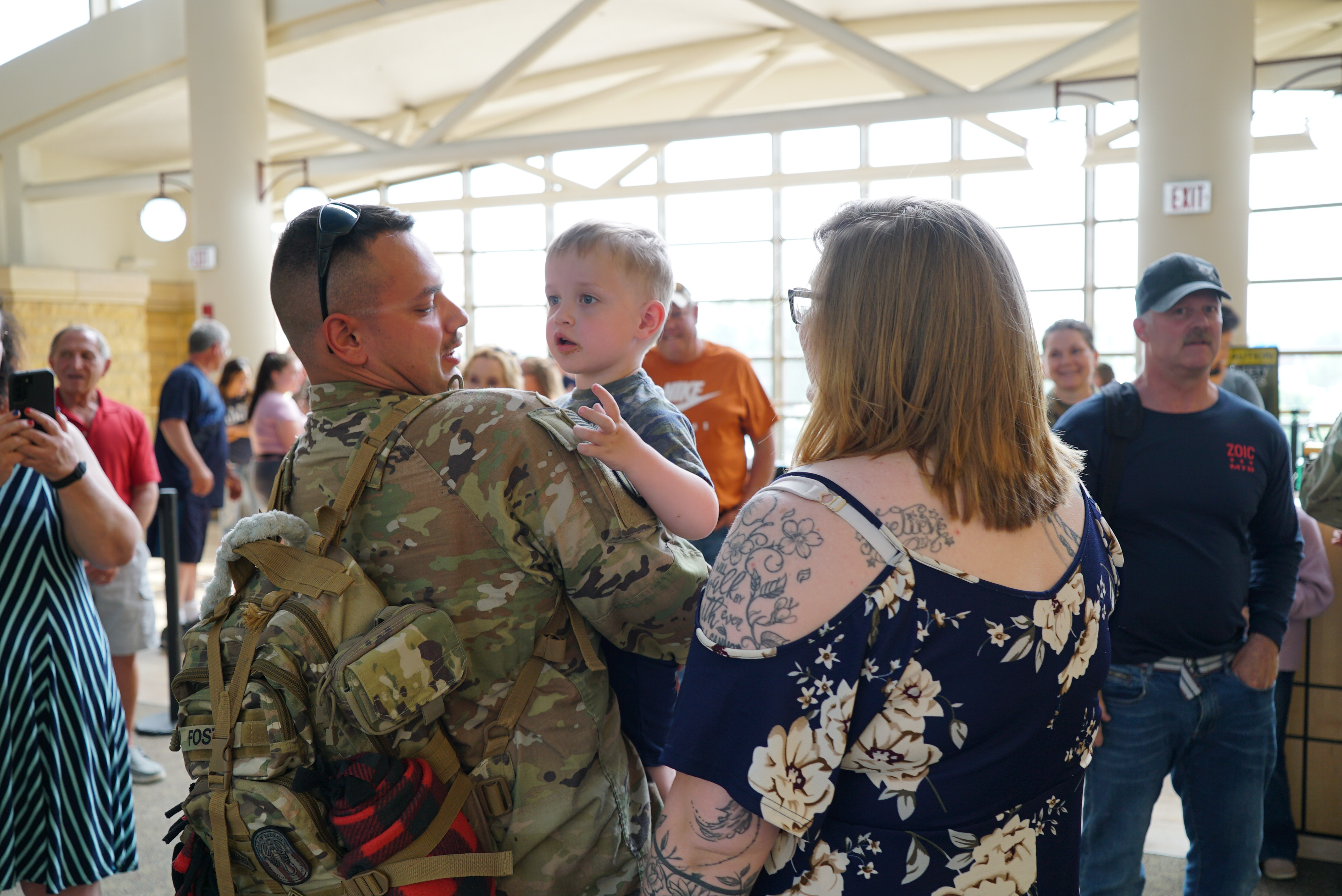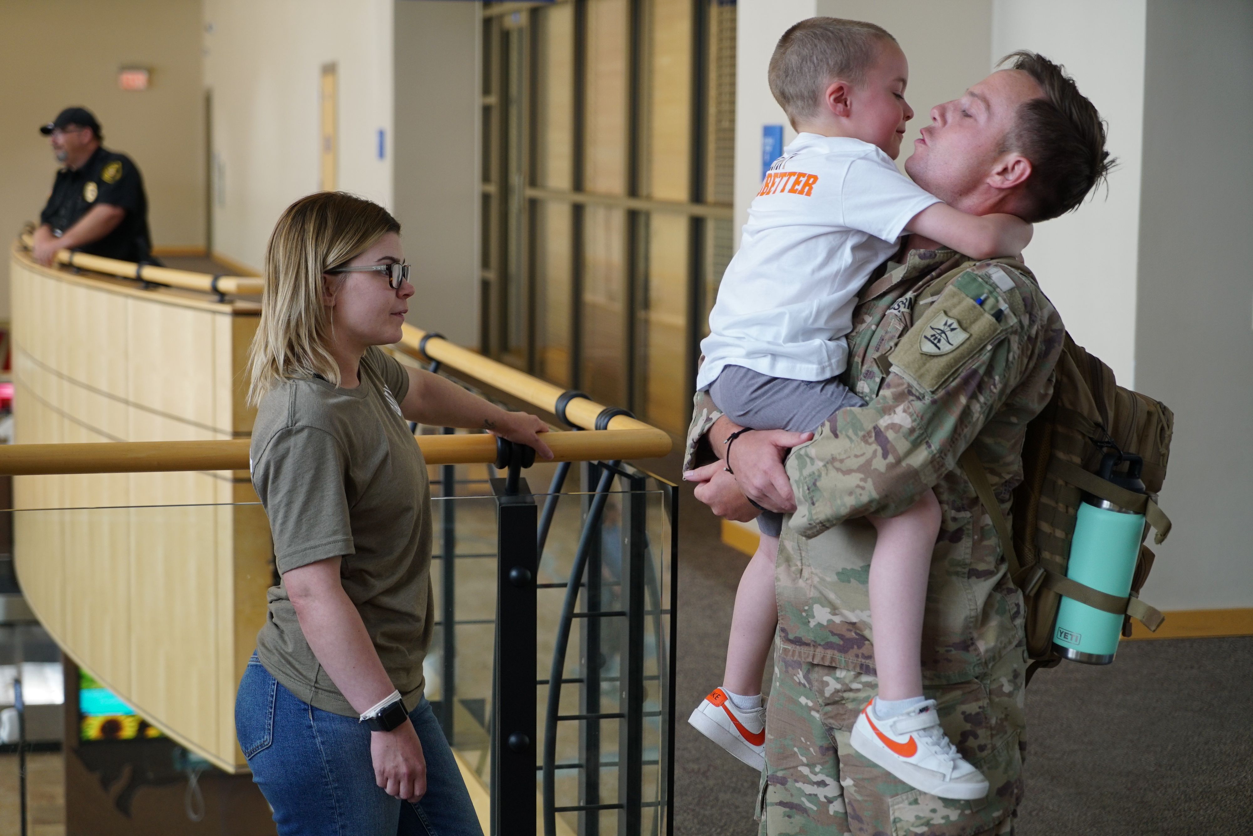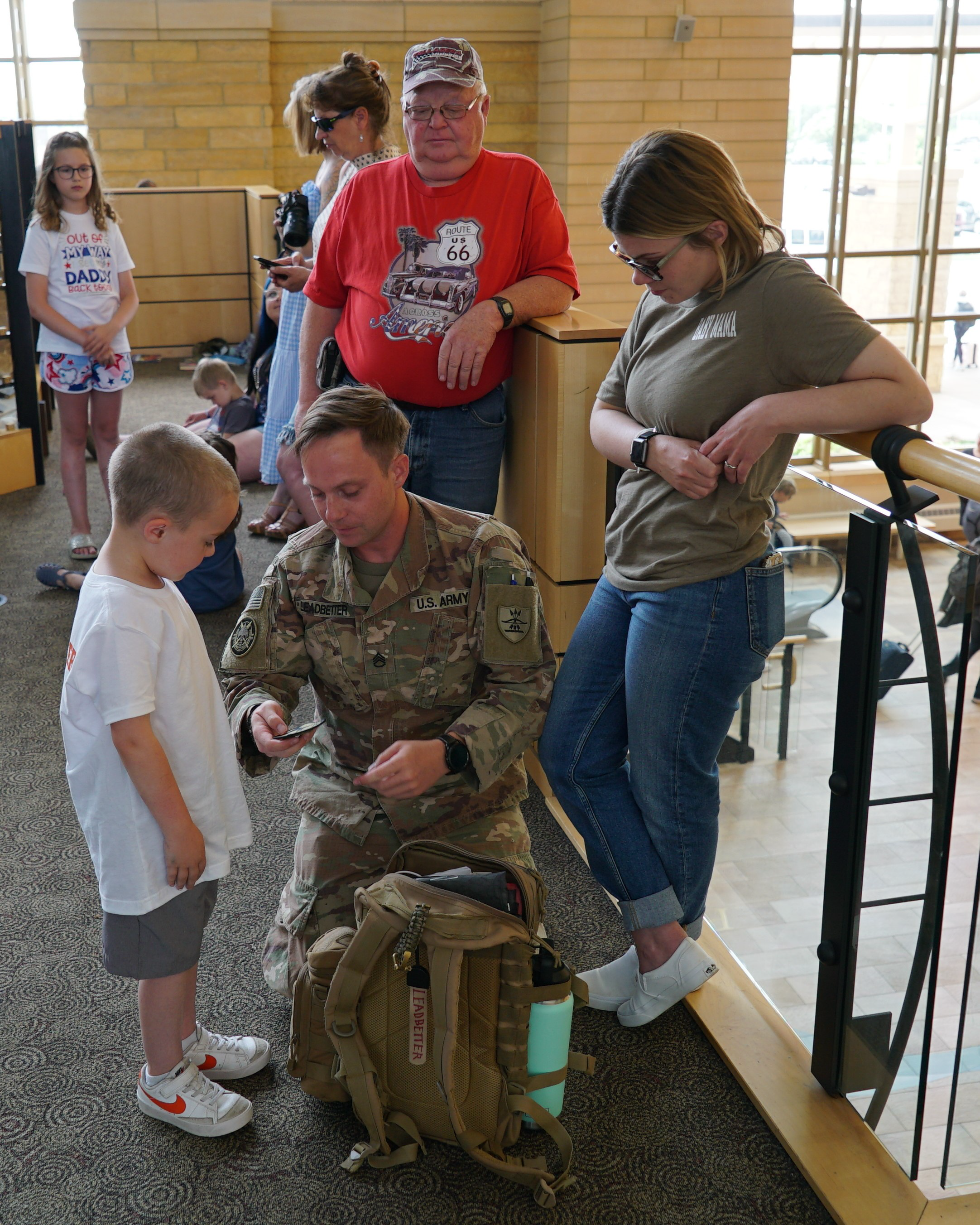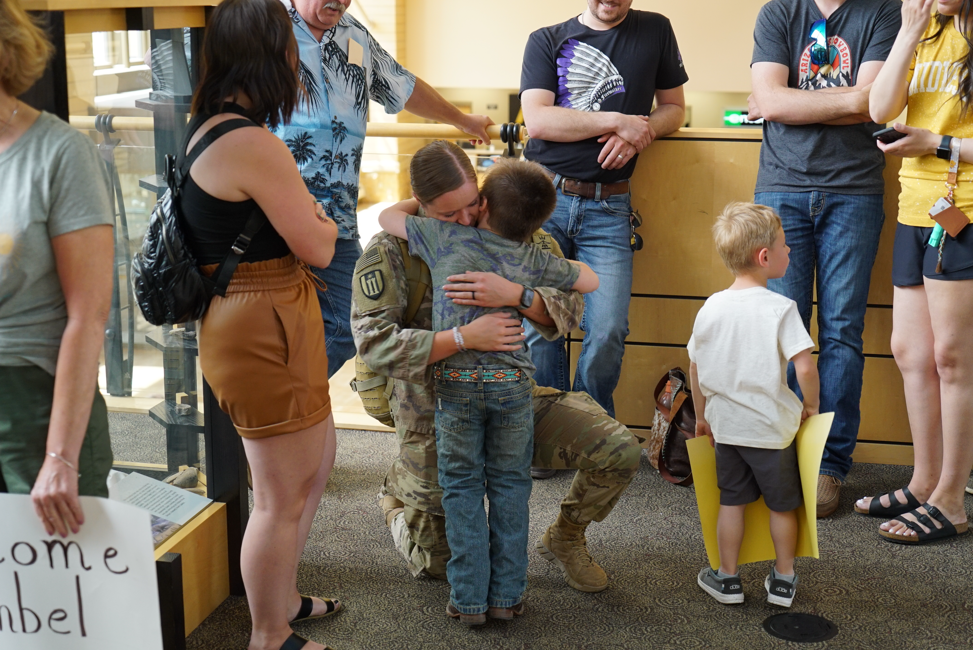 Top photo: Family members hold a welcome sign for their Soldier, a member of the 835th Engineer Utilities Detachment, Bismarck Municipal Airport, June 18, 2022.