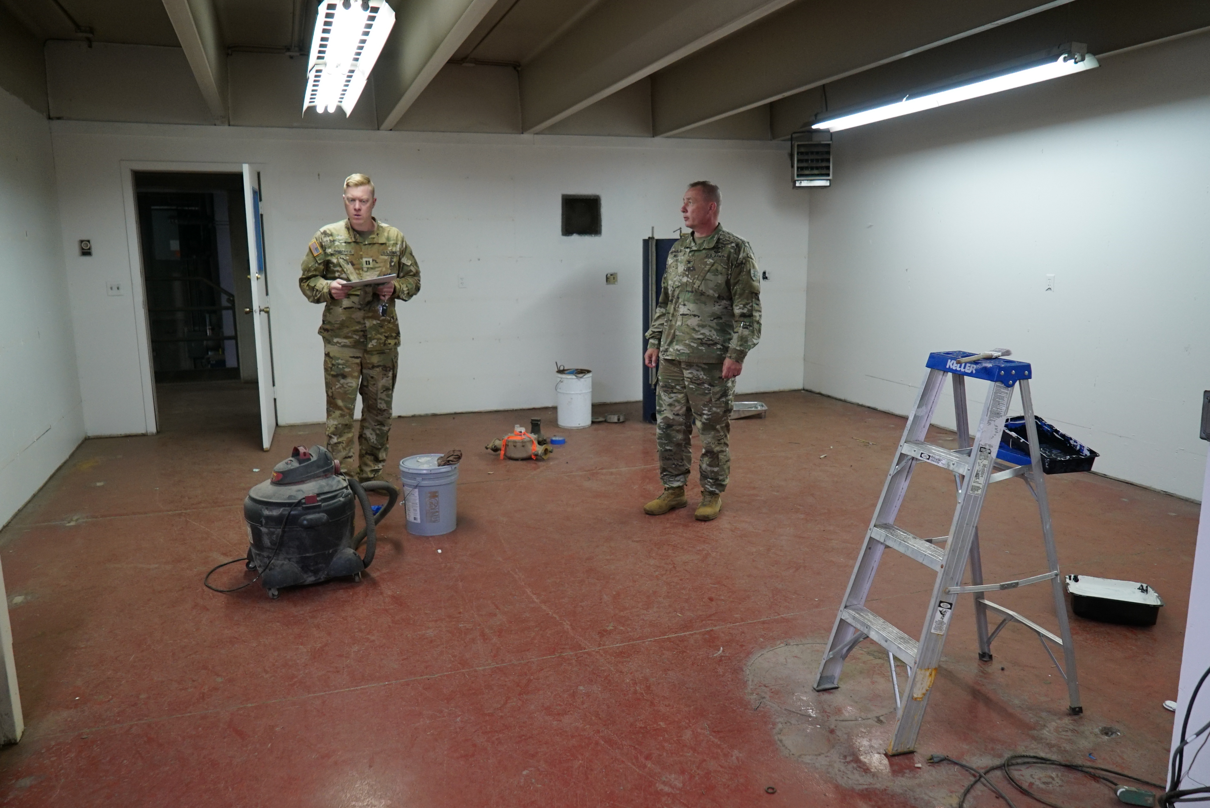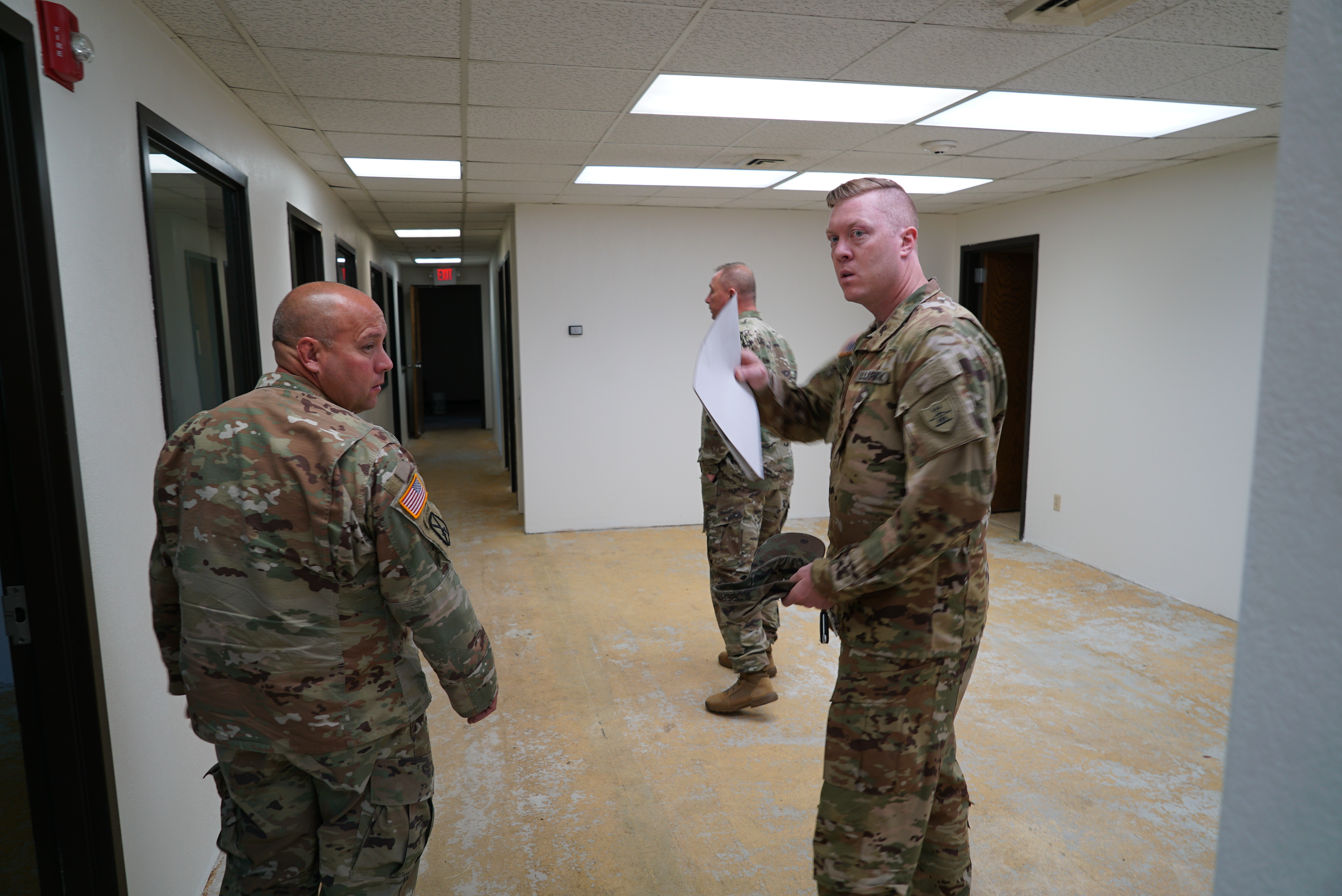 Command Sgt. Maj. Jeff Sayler, command sergeant major for the N.D. Army National Guard Recruiting and Retention Battalion, left, discusses proposed office arrangements for the recruiting office with Capt. Conrad Roberts, N.D. Army National Guard Deputy Construction and Facility Management Officer, Williston, June 23, 2022.