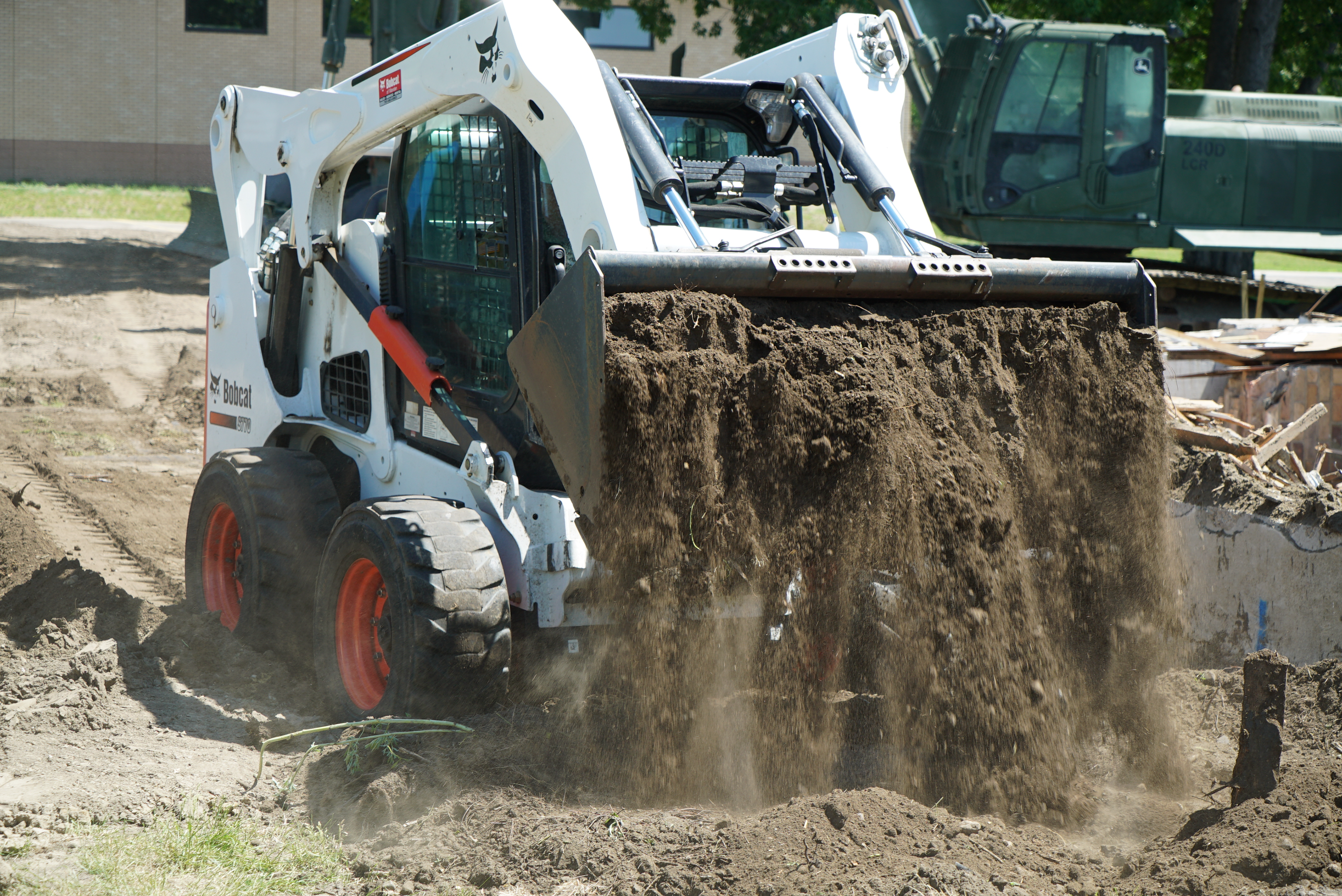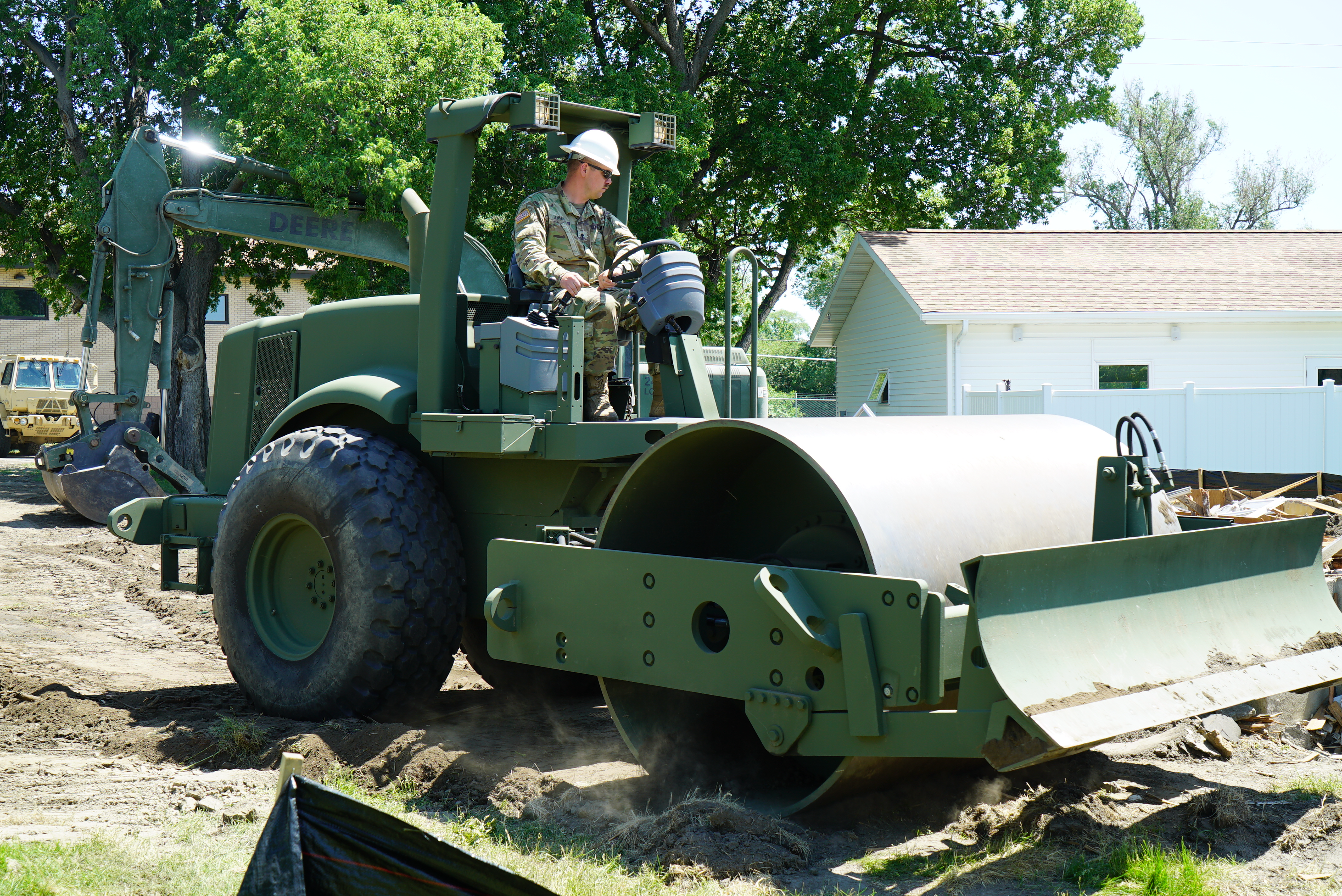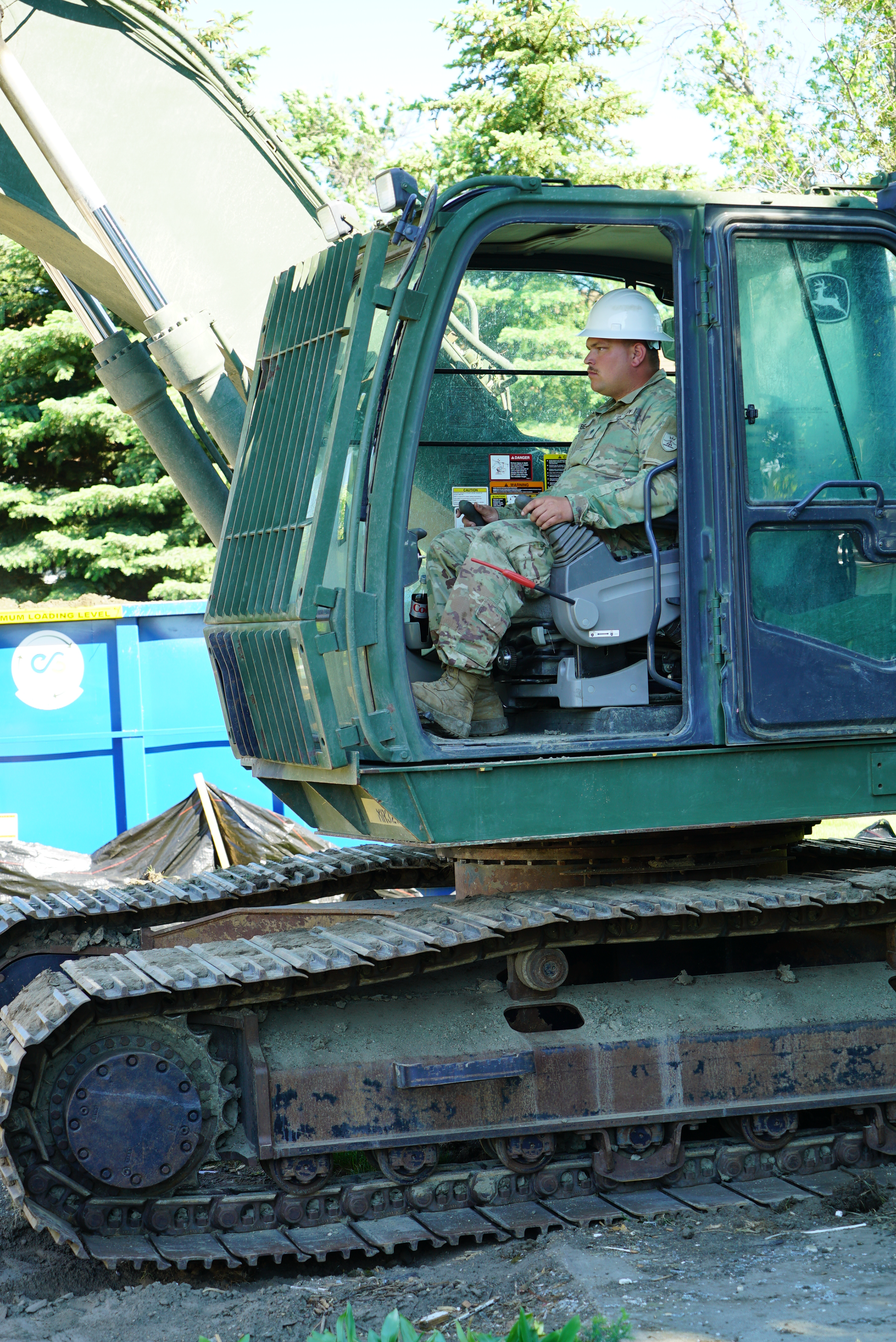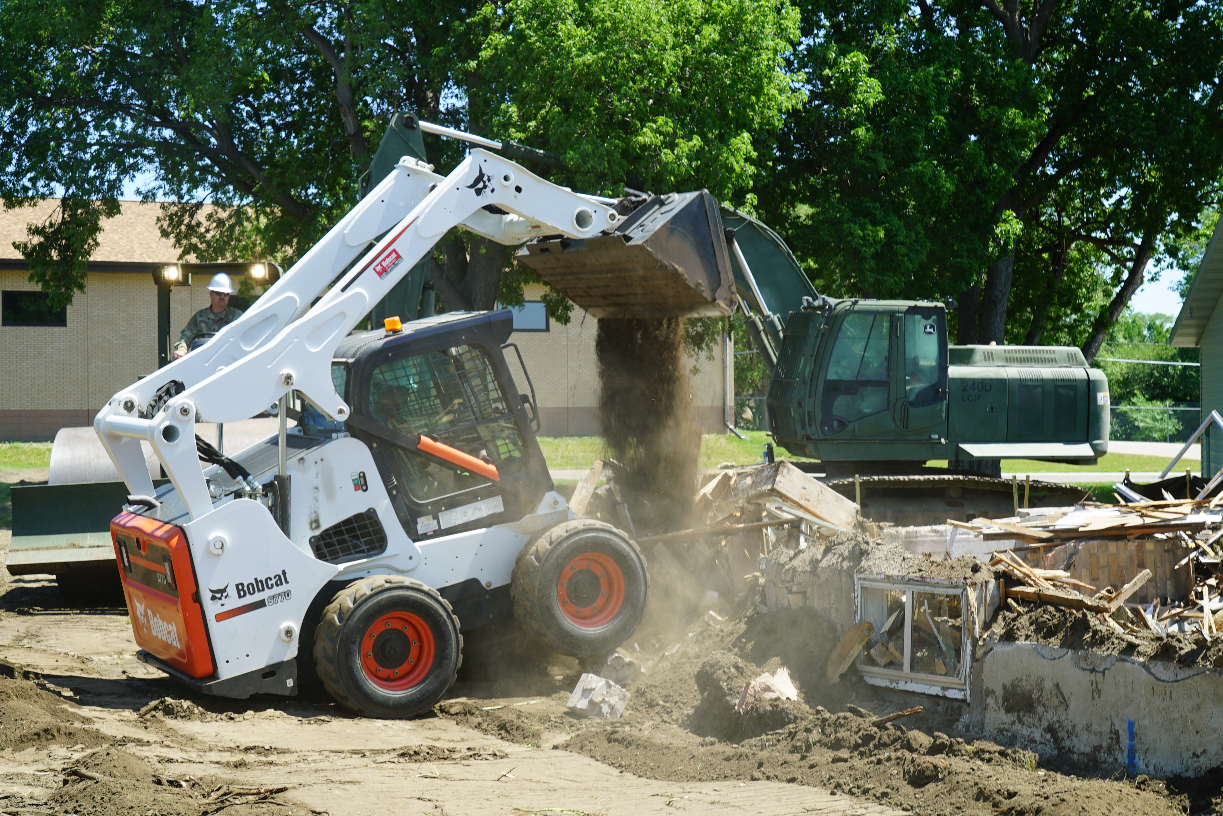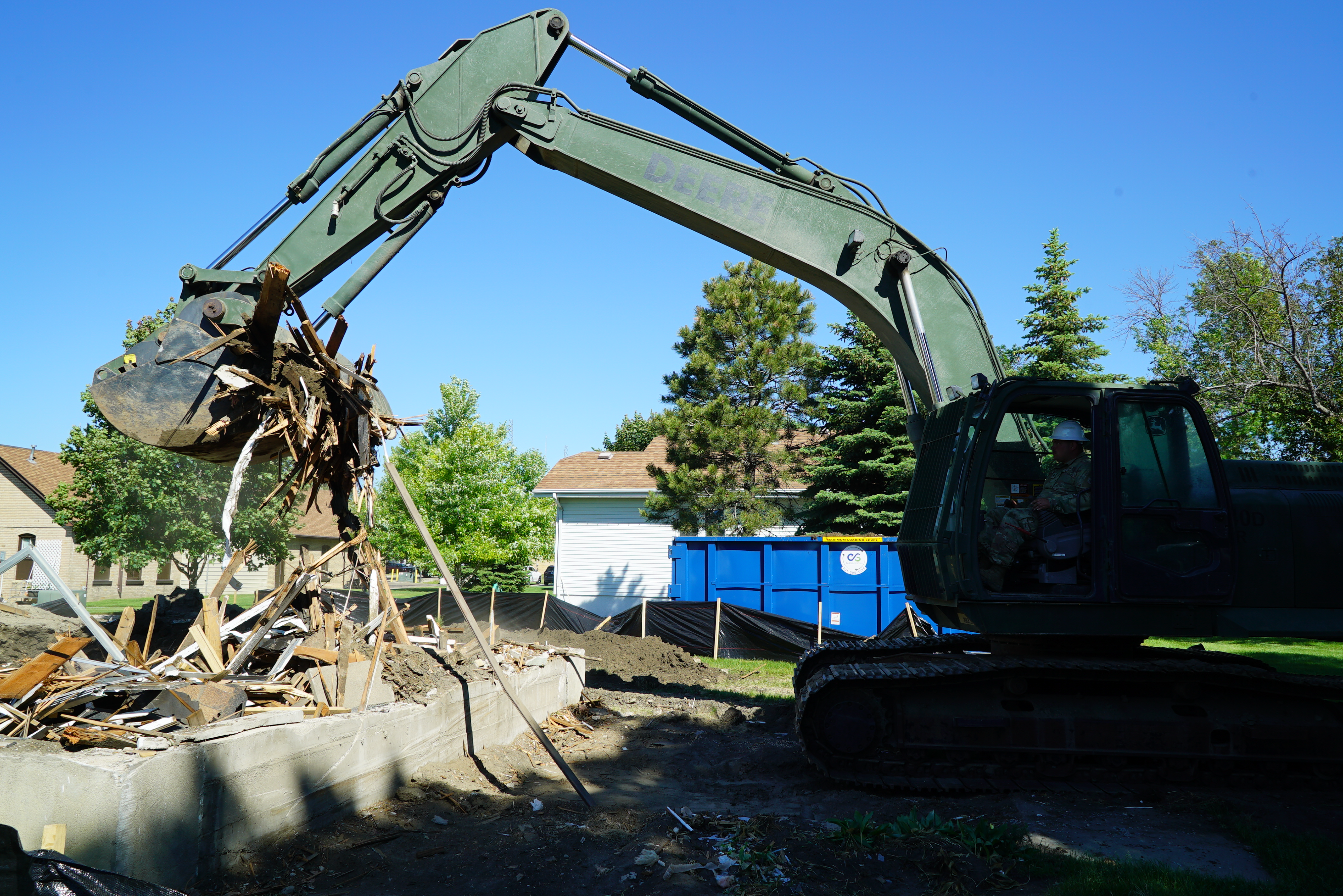 Spc. Andrew Beine, 957th Engineer Company, uses a John Deere 240D Hydraulic Excavator to transfer debris from the basement of the demolished house to dumpsters, Fraine Barracks, Bismarck, N.D. June 17, 2022.