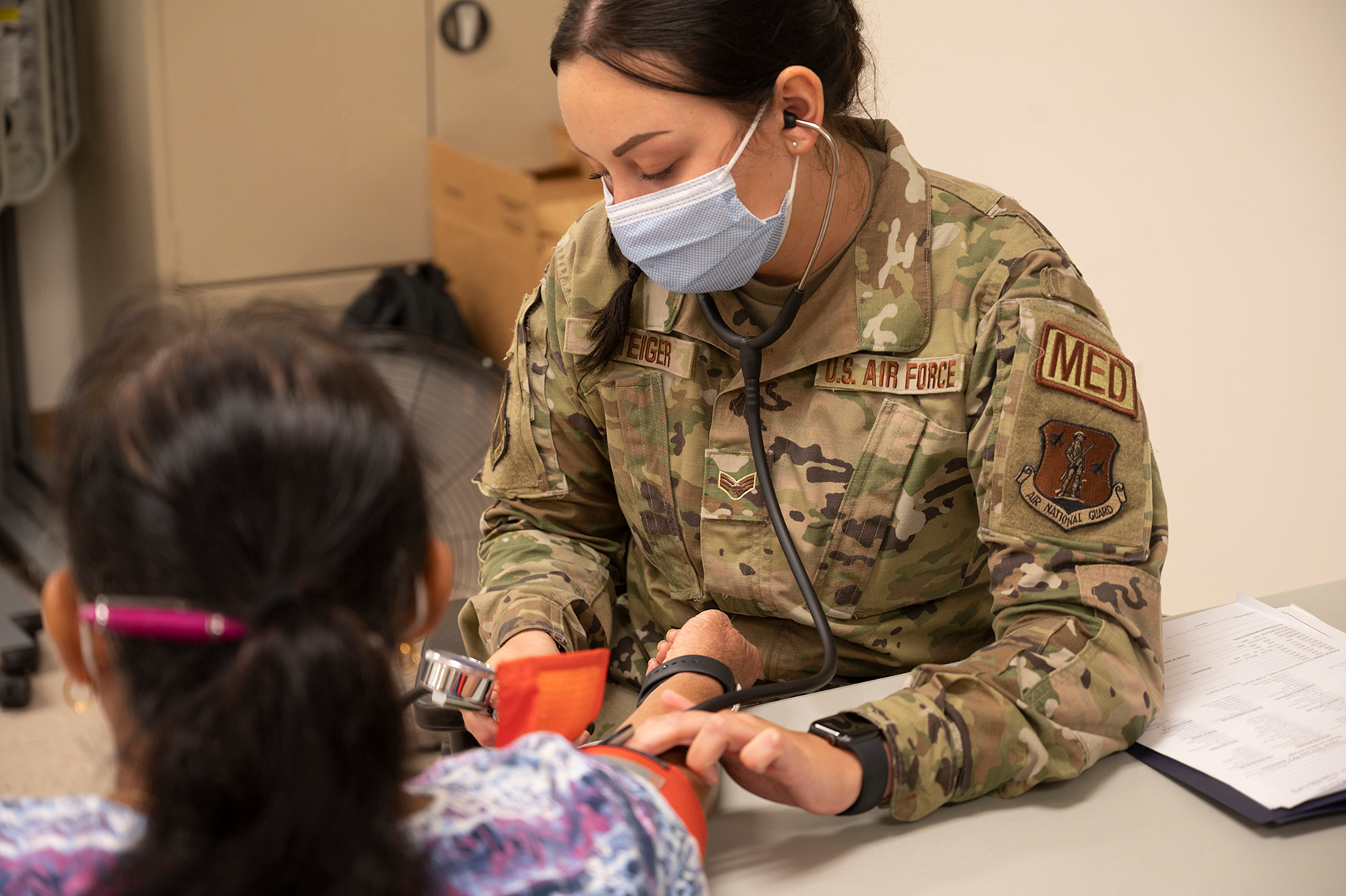 Senior Airman Alexandria Steiger, health technician, 119th Medical Group, assesses a patient's blood pressure during Tropic Care 2022 in Lihue, Hawaii, June 13, 2022.
