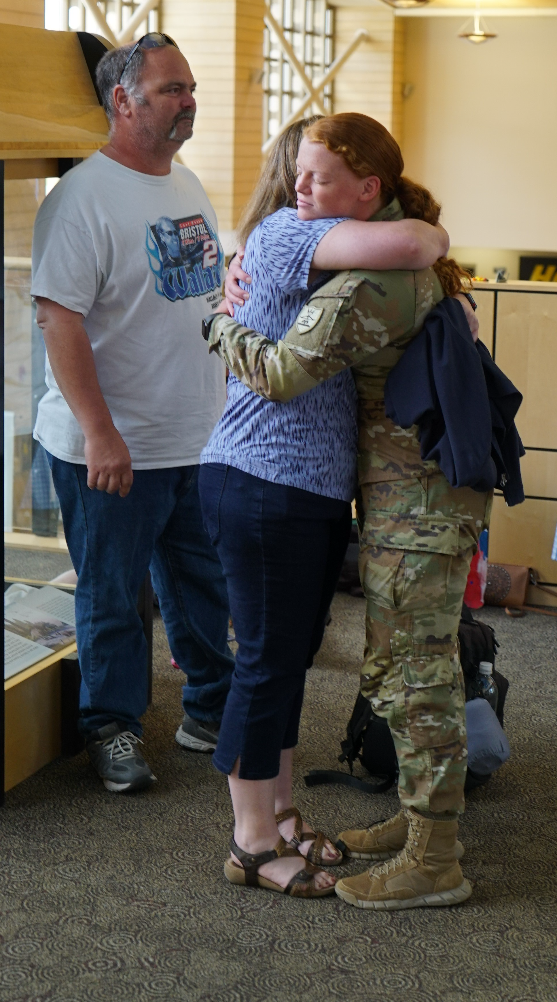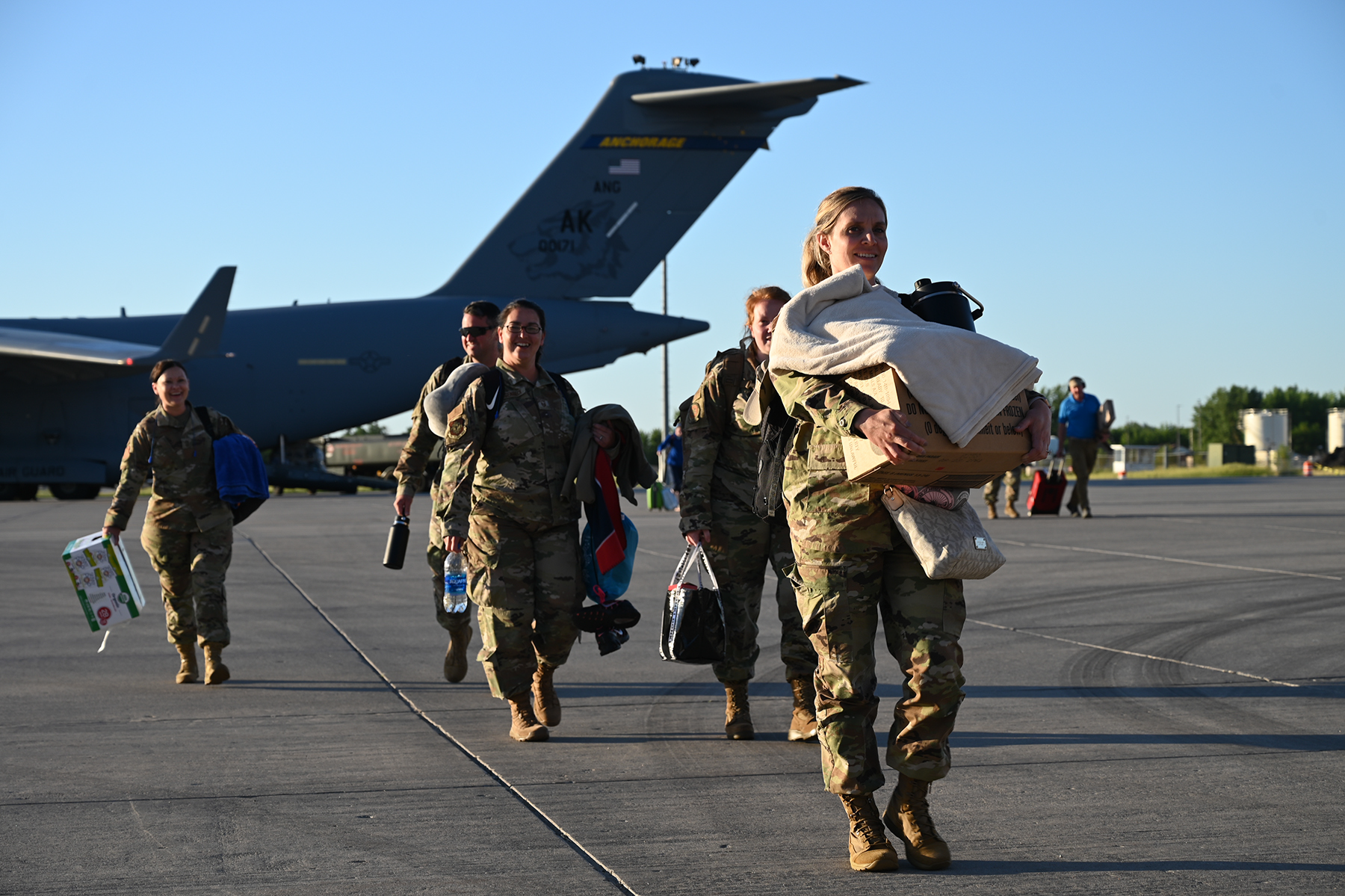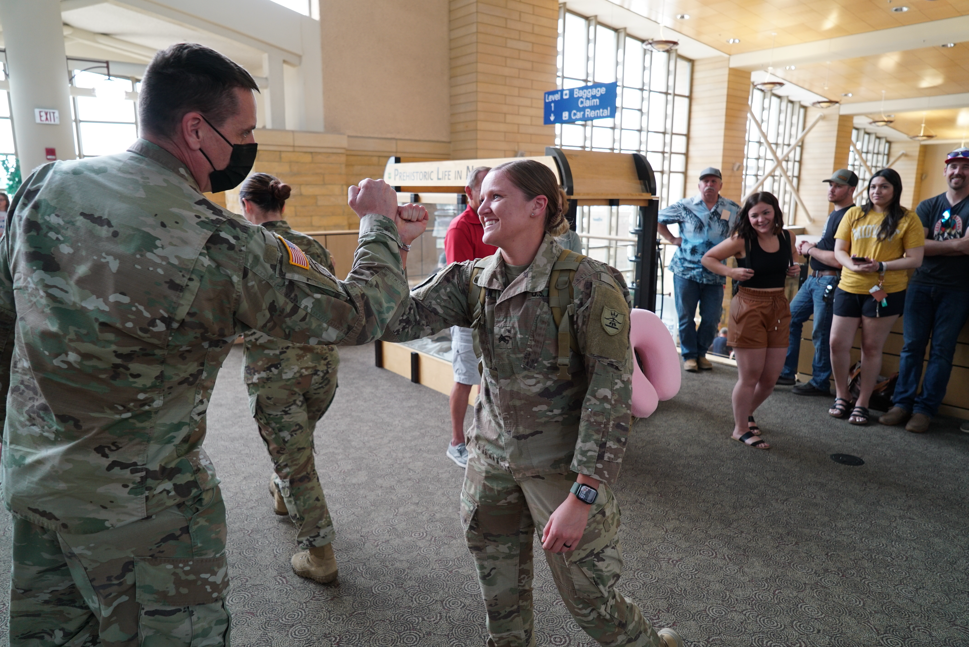 Most of the Soldiers flew into airports in Fargo, Minot, Grand Forks and Bismarck. Brig. Gen. Jackie Huber, deputy adjutant general, and Brig. Gen. Jon Erickson, commander, N.D. Army National Guard, were at the Bismarck Municipal Airport to greet Soldiers who arrived there. The engineers spent nearly a year in U.S. Central Command (CENTCOM) area of operations working on construction projects.