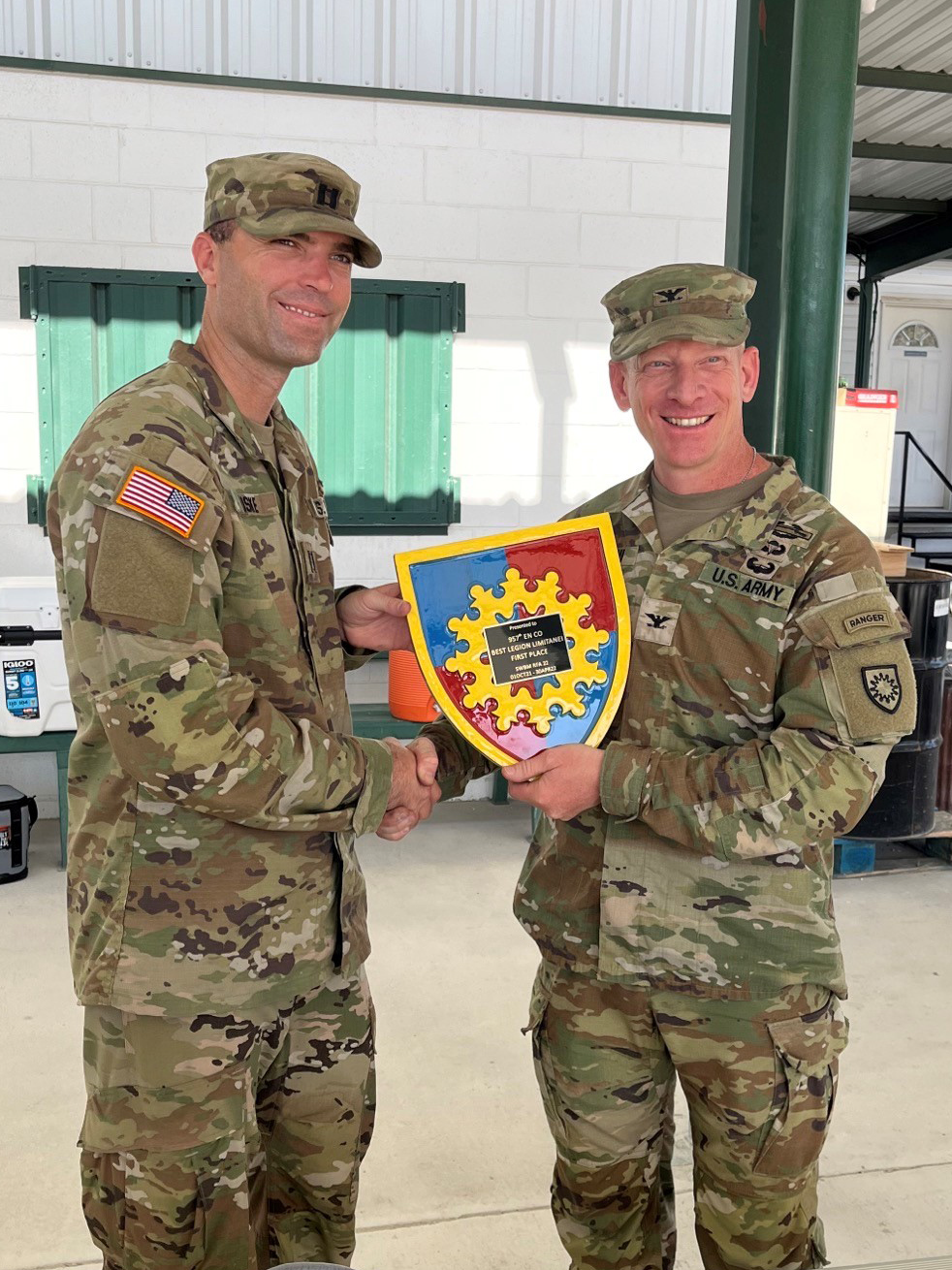 Col. Kent D. Cavallini, commander, 149th Maneuver Enhancement Brigade, right, presents the Best Legion Award to Capt. Mark Buske, commander, 957th Engineer Company (Forward), Del Rio, Texas, June 19.