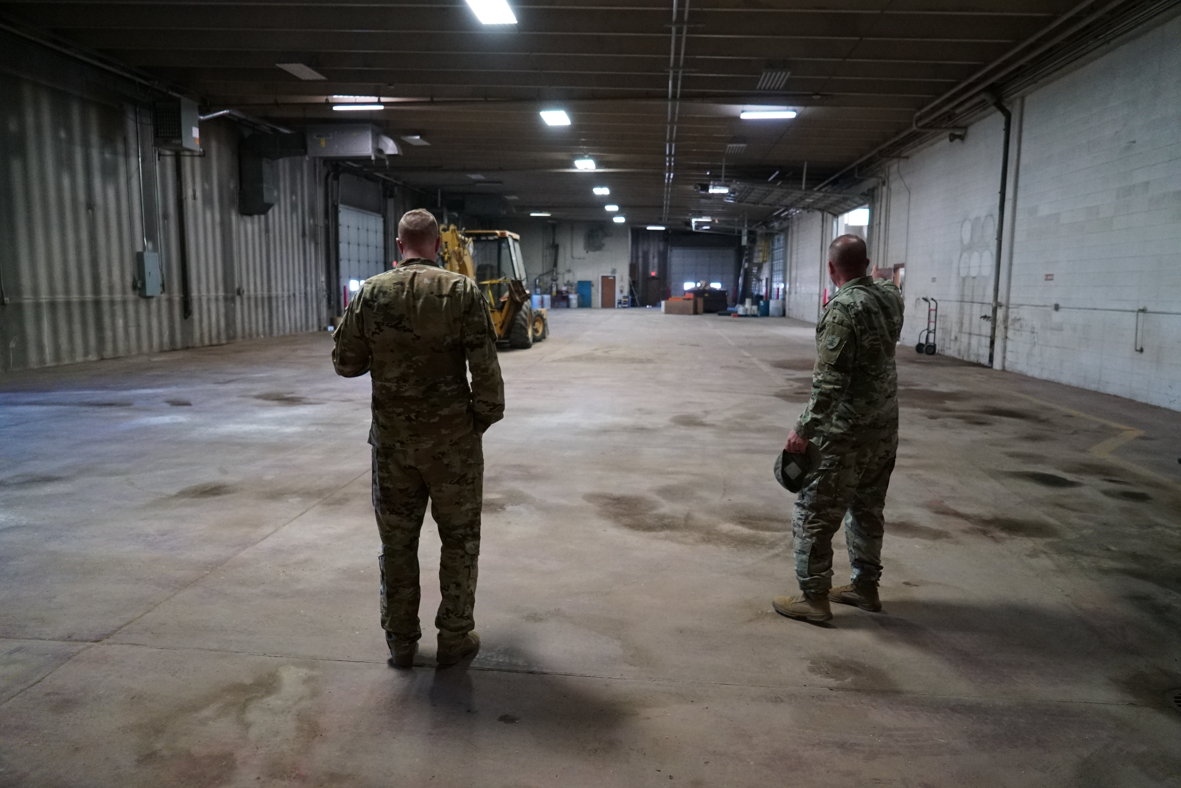 Col. Russell Wolf, N.D. Army National Guard Construction and Facility Management Officer (CFMO), and Capt. Conrad Roberts, deputy CFMO, inspect the future maintenance bay, Williston, June 23, 2022.
