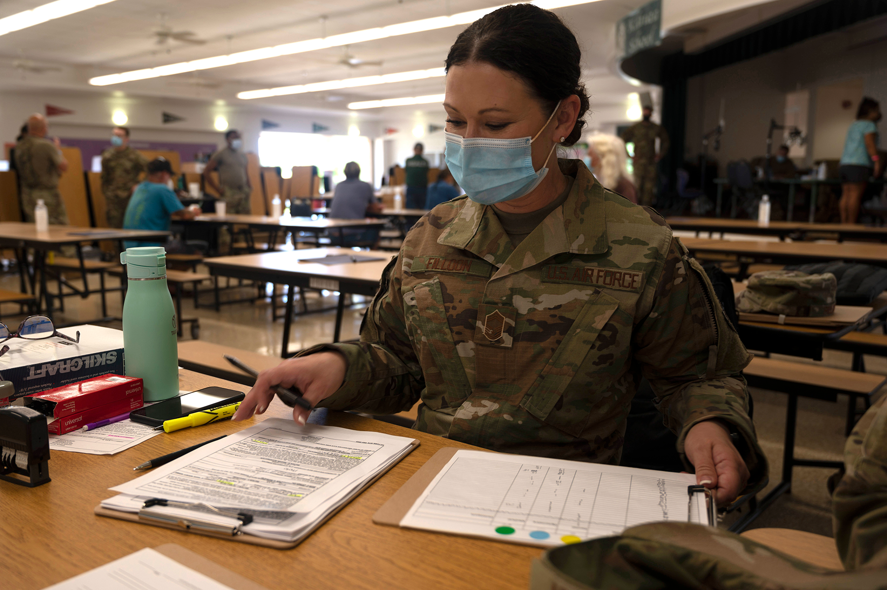 Chief Master Sgt. Merri Jo Filloon, senior enlisted leader, 119th Medical Group , prepares in-processing documents during Tropic Care 2022, Lihue, Hawaii, June 13.