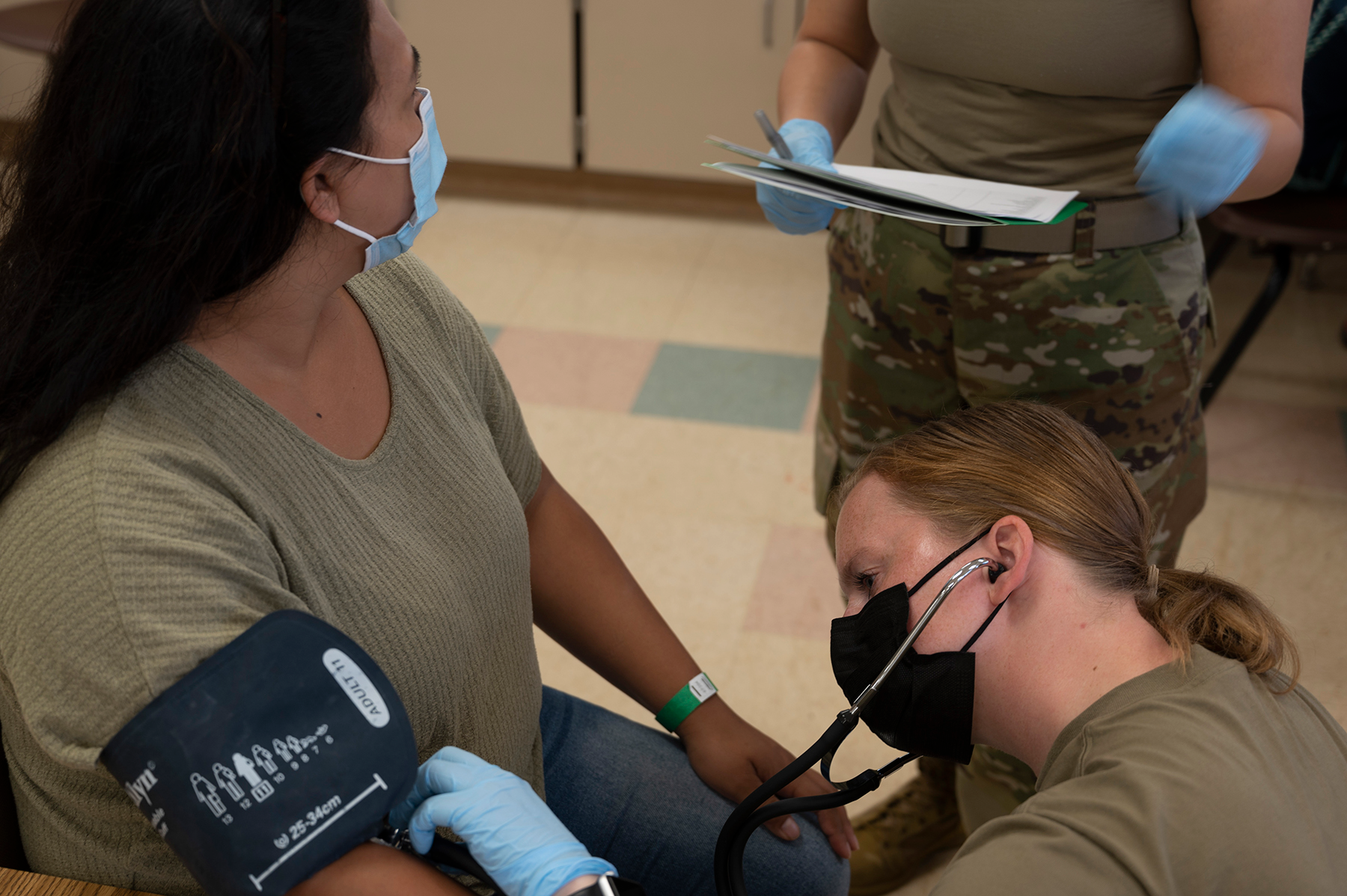2nd Lt. Kally Anderson, a nurse with the 119th Medical Group, assesses a patient's blood pressure in Lihue, Hawaii, June 14, 2022.