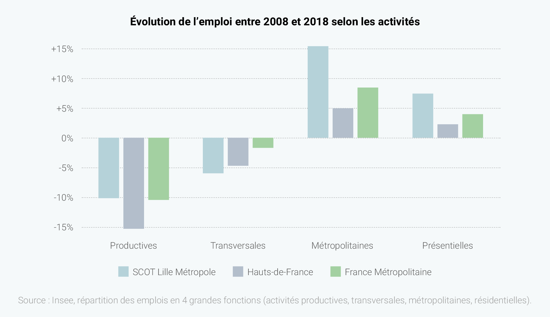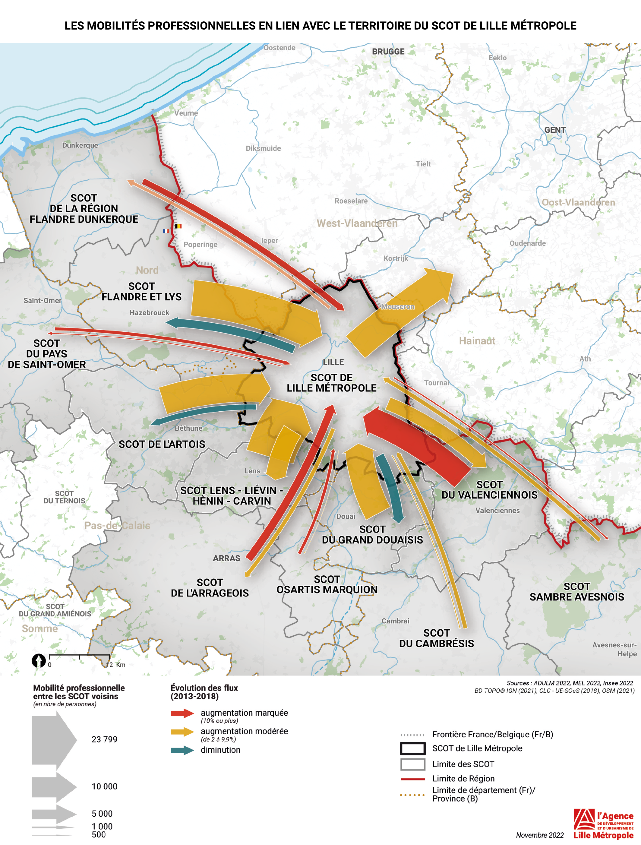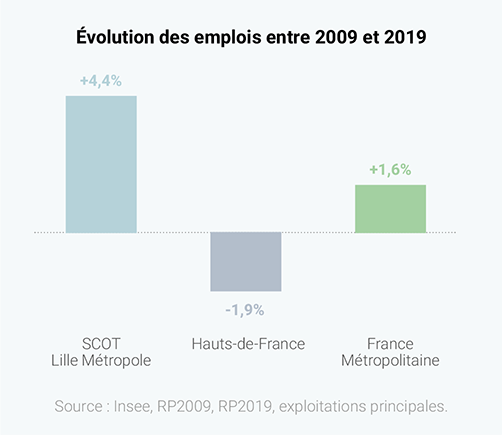Le territoire du SCOT de Lille Métropole connaît une progression constante de son nombre d’emplois depuis une dizaine d’années et affiche aujourd’hui plus de 550.000 emplois (dont près de 23.000 créés en 10 ans), dans un contexte où ses voisins et la région Hauts-de-France sont dans des dynamiques globalement négatives.