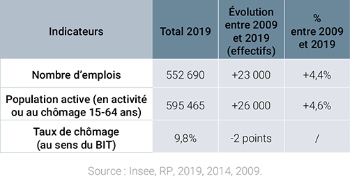 La population active métropolitaine est de 595.000 personnes en 2019. La croissance de la population active, entre 2014 et 2019, est supérieure au scénario tendanciel, mais reste bien en-deçà du scénario regain d’attractivité. Le nombre d’emplois connaît quant à lui un taux d’augmentation qui reste calé sur le scénario «tendanciel». Ces premières tendances invitent à rester vigilant sur l’adéquation entre la croissance du volume d’emplois du territoire et la croissance de sa population active. En parallèle, le chômage tend à la baisse (-2 points en 10 ans).