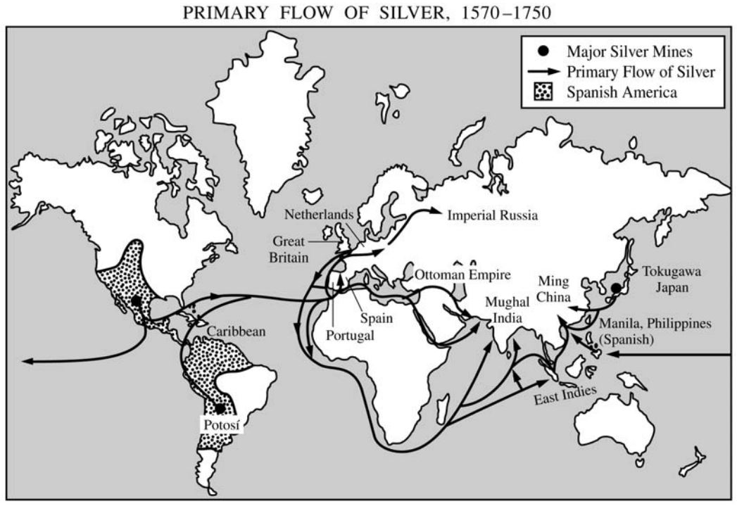 KC-4.1.IV - The new global circulation of goods was facilitated by chartered European monopoly companies and the global flow of silver, especially from Spanish colonies in the Americas, which was used to purchase Asian goods for the Atlantic markets and satisfy Chinese demand for silver. Regional markets continued to flourish in Afro-Eurasia by using established commercial practices and new transoceanic and regional shipping services developed by European merchants.