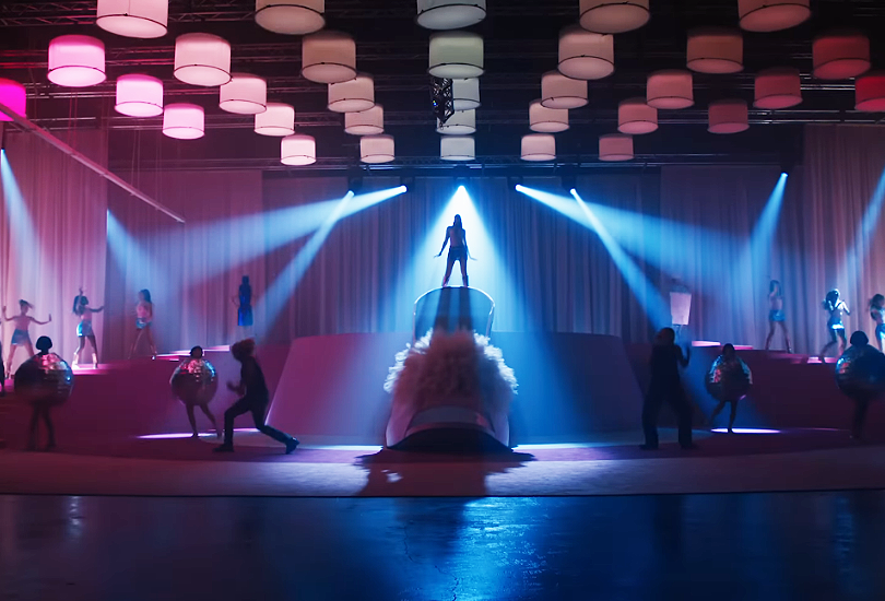 Strobe Disco floor with tiles written 'Dance the Night',(switches colours) then by Dua Lipa appears.