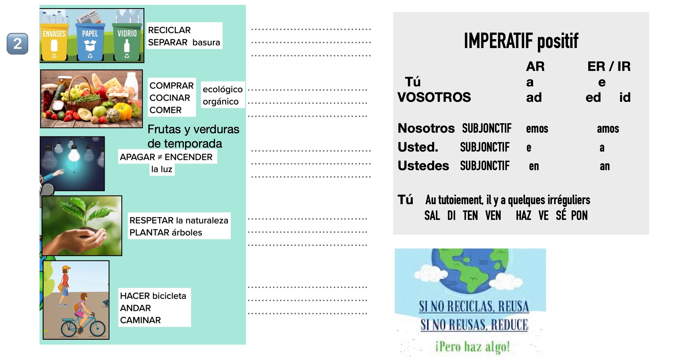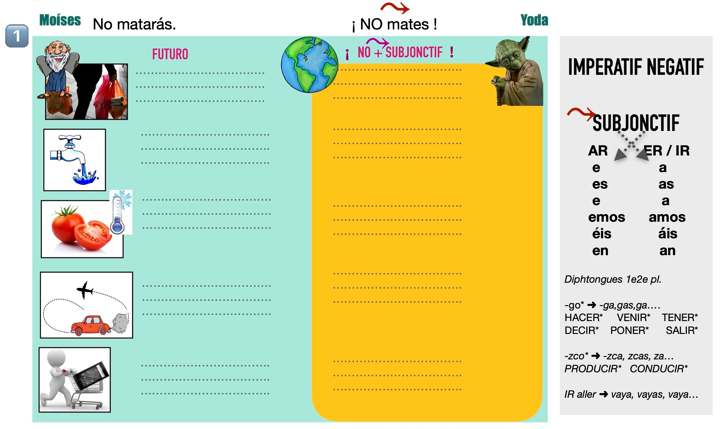 PROPOSITION d'une ACTION COLLECTIVE, CONEILS? INTERDICTION collective : faisons quelque chose pour la planète, sauvons la planète, ne cherchons pas ailleurs... => en espagnol, ce sera au SUBJONCTIF présent à NOSOTROS