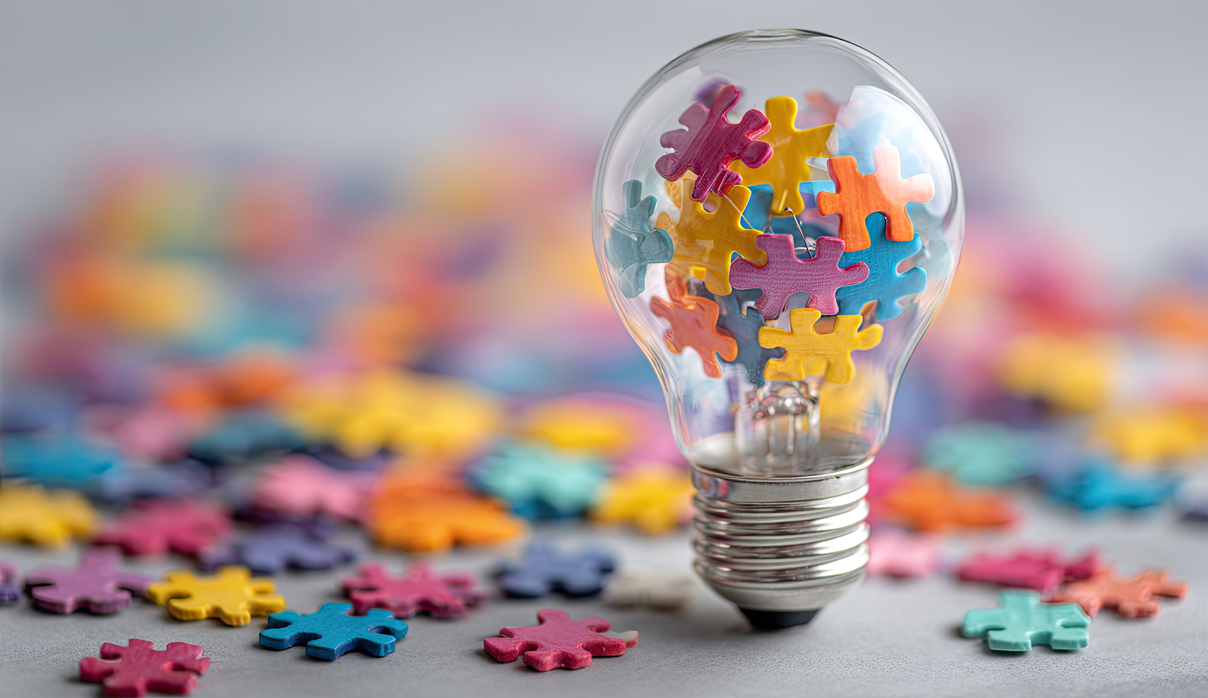 Created with images by Dipsky - "A playful cartoon character shaped like a popcorn bucket stands confidently with a wide smile and raised finger.,Copy space" • Afdin - "Glass light bulb containing puzzle pieces, surrounded by more scattered, colorful jigsaw pieces" • Andrii - "Let's get started - motivational phrase is shown using the text"