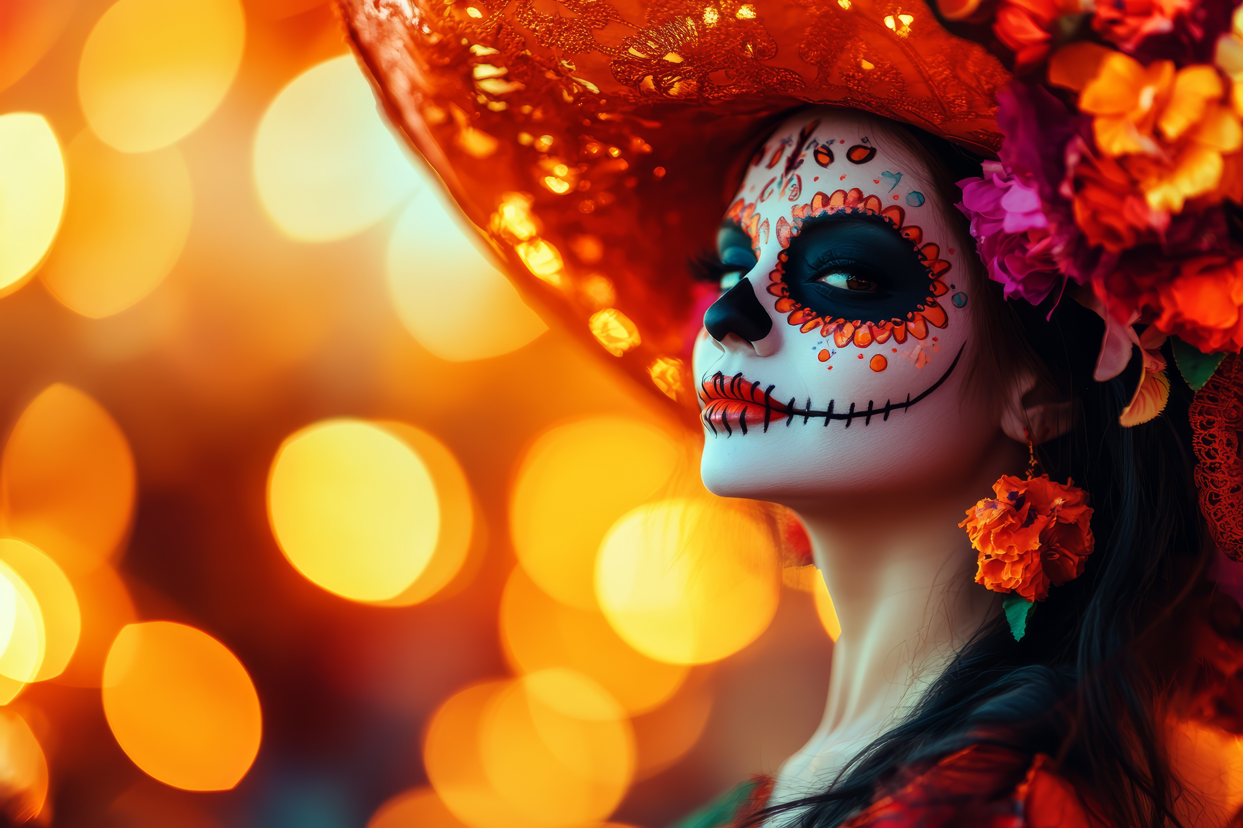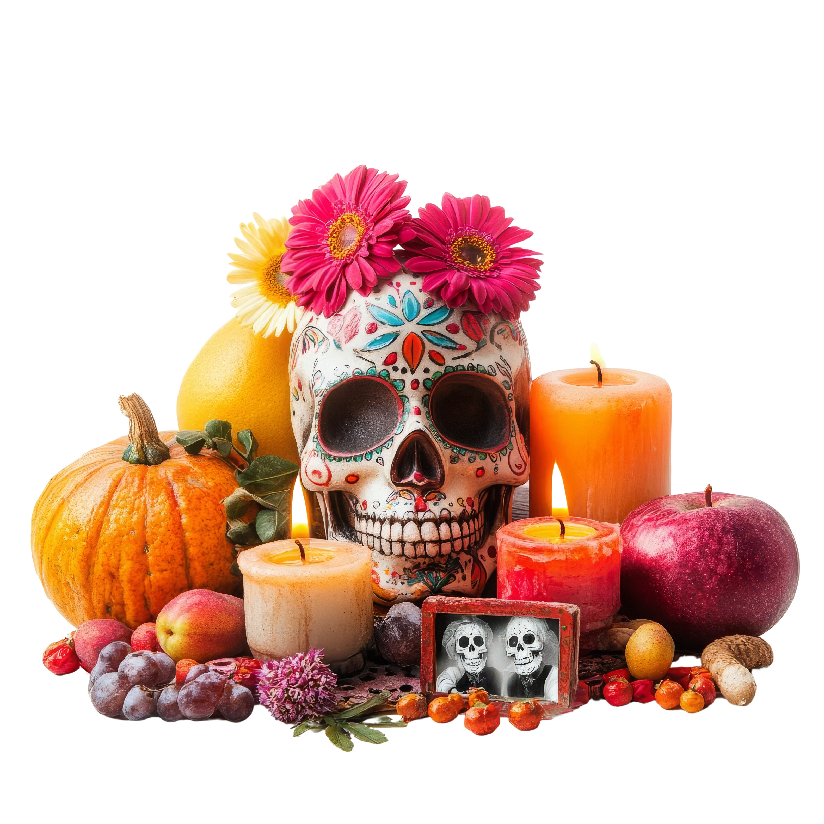 Created with images by StirfryMoJi - "Hispanic heritage sugar skull marigold Festive dia de los muertos background 3d render digital illustration " • KENZOGROW - "A vibrant Day of the Dead altar featuring a decorative skull, colorful flowers, candles, and seasonal fruits." • Simon - "Young woman with La Catrina make-up to celebrate Dia de los muertos. Mexican tradition, culture and heritage concept. Traditional skull/calavera costume with a big, red hat. Bokeh effect background."