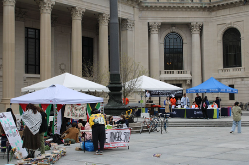 While tents for the marrow drive stood by the Schwarzman Center entrance, pro-divestment protesters filled a part of the plaza in front of the World War I memorial, surrounded by works of art and stacks of books.
