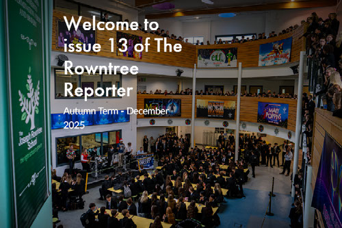 Welcome to our latest edition of the Rowntree Reporter that is jam packed with information about events and visits our students have been involved in. It is always lovely to see students representing our school so well, and benefiting from the opportunities that members of staff provide for them. Whilst Christmas can easily become about the presents that are given, I hope that you also enjoy the gift of spending time with your families and friends, and have a restful holiday period. Mr Hewitt, Headteacher