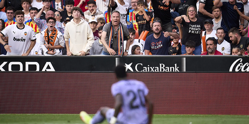 Vinicius Jr veers away from the 6-yard line, looking a fan in the eyes. Lucas Vazquez rushes to his defense, shouting at the fan. It is unclear as to what is going on. Gradually, more and more Madrid players rush beside Vinicius, as more and more Valencia players hold them back. Voices are yelling over each other.