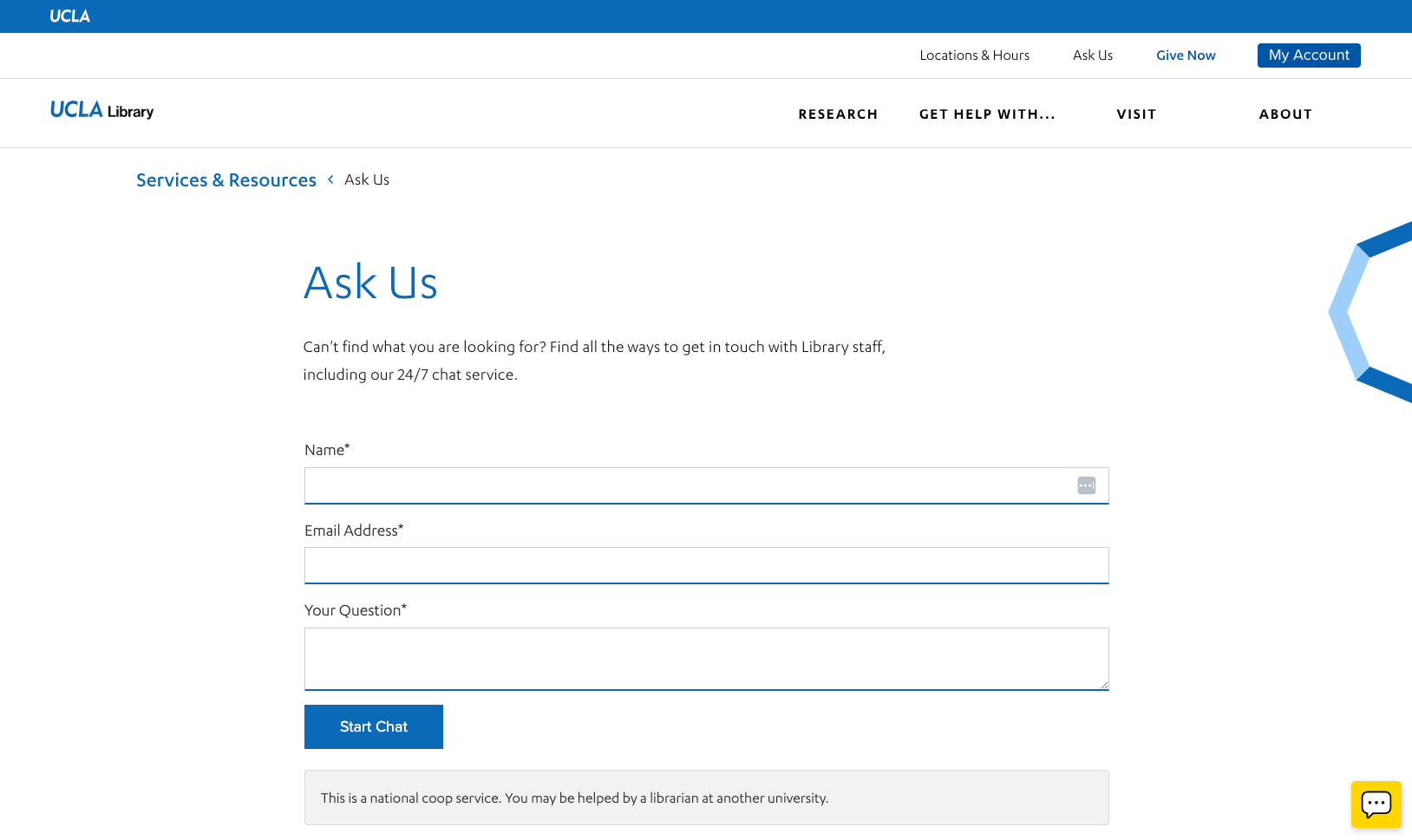 Looking for help at 2am? Ask us a question via chat 24/7! This chat service is available on our website. Please note that this is a co-op service and the person answering your question may not work at the UCLA Library. This is a good option for you if: it's outside normal business hours and you need help right away.
