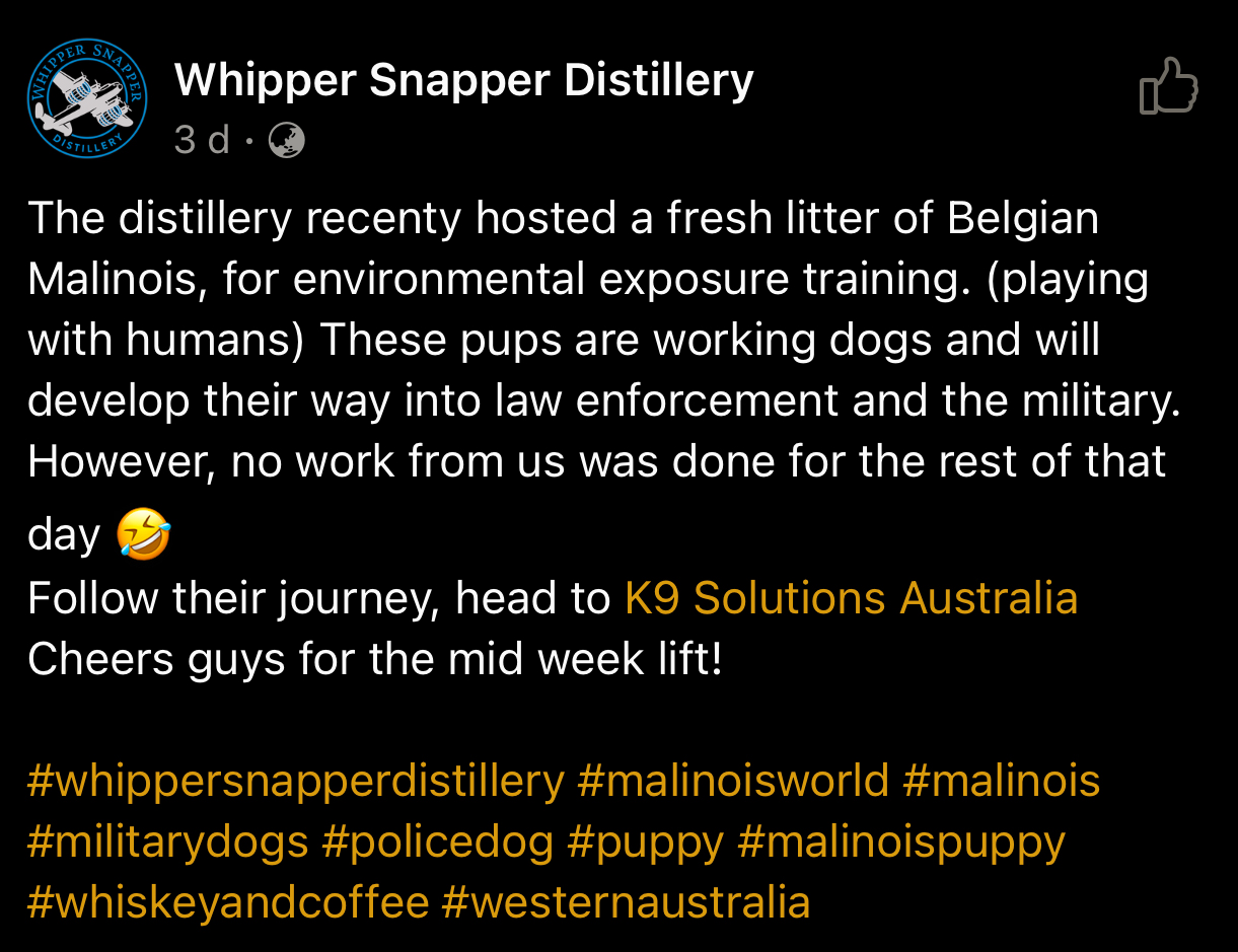 Whipper Snapper Distillery were kind enough to let us take our VHK Alpha Litter to the distillery for some exposure work. A social dog is able to focus on the handler before yielding to environmental distractions, such a new people, startling sounds, or other animals, and there was plenty of that. Development processes for young pups are essential and Whipper Snapper Distillery were more than willing to assist in the development program for the VHK Alpha Litter.