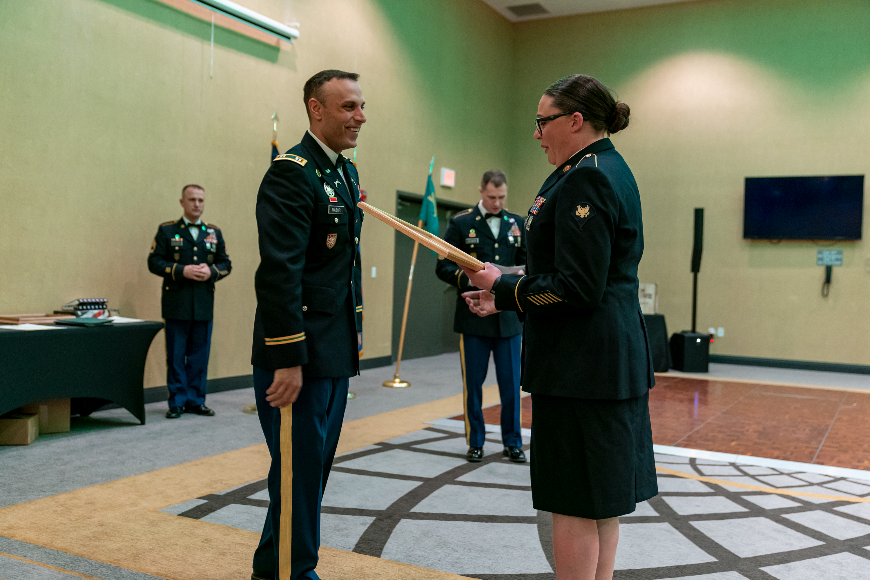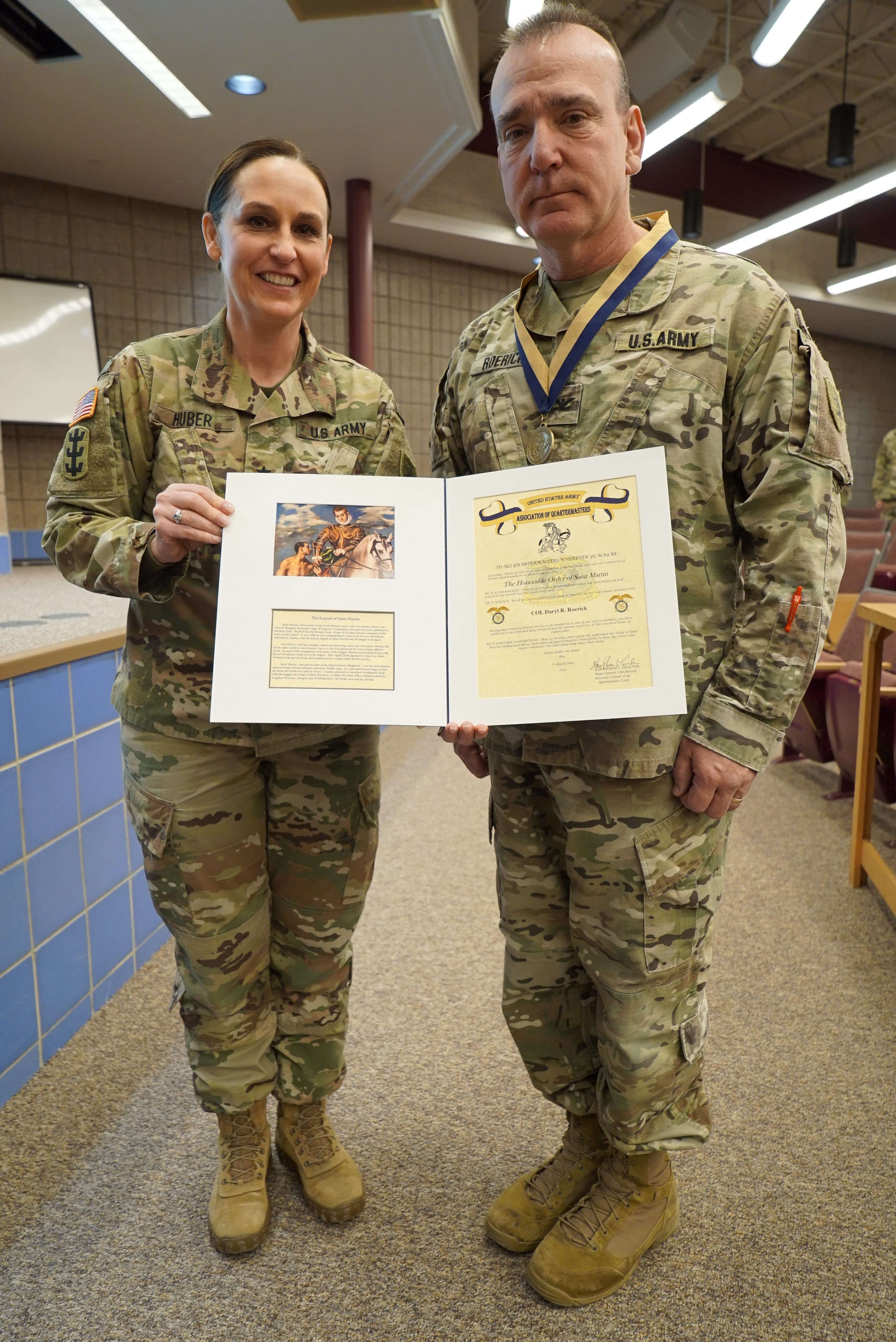 Col. Daryl R. Roerick, N.D. National Guard director of logistics and Region 6 Chair for the Executive Advisory Group for Logistics Excellence (EAGLE), received the Honorable Order of Saint Martin Award on Jan. 28 in Bismarck. Roerick received this Association of Quartermasters award for being instrumental in proving guidance and vision transforming the logistics conference to a training workshop. Brig. Gen. Jackie Huber, deputy adjutant general presented the award and also recognized Roerick's achievement with a coin.